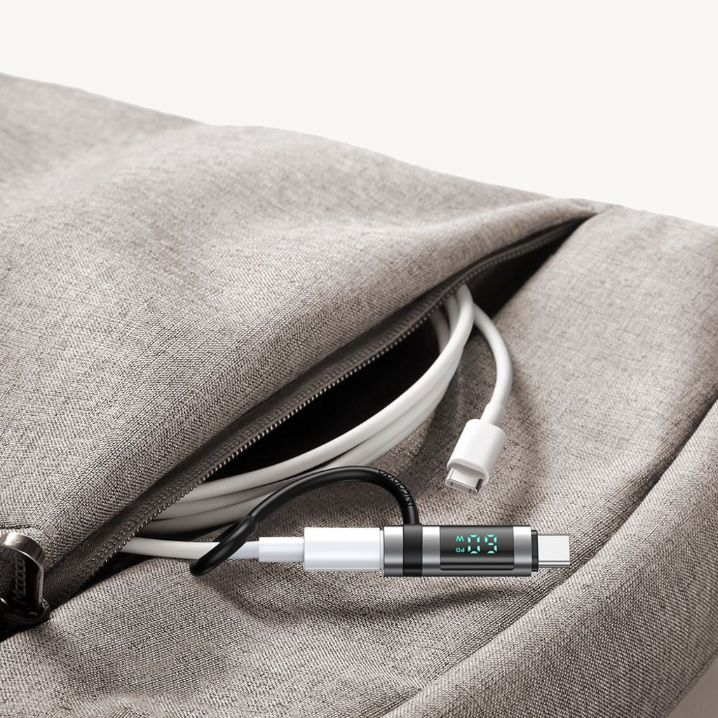 Adapter Mcdodo OT-0180 szilikon akasztóval, alumínium ötvözetből, Lightning USB-C-re, 60W, HD LED kijelző - Fekete