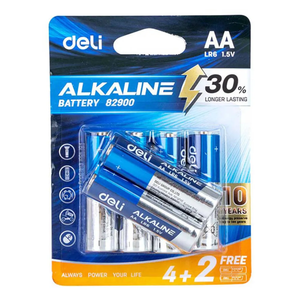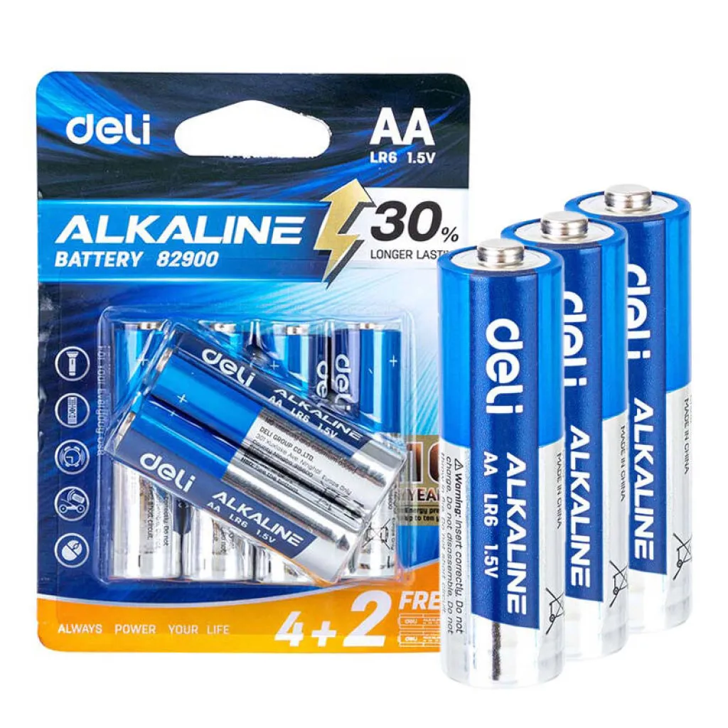 Deli AA LR6 1.5V alkaline batteries allow you to power everyday devices such as TV remote control, flashlight, computer mouse, clock, toys and many others. They have been internally coated with a special coating that improves their conductivity and extends their life. This, combined with the use of steel of uneven thickness has made it possible to increase their performance by up to 30%. The set includes 6 batteries.
