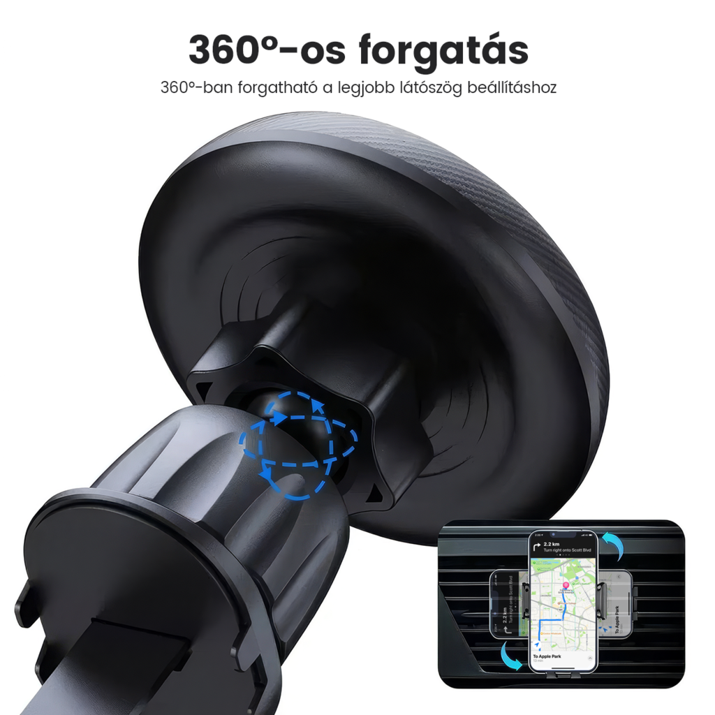 - Optimalizált látószög: A 360 fokban forgatható fej lehetővé teszi, hogy a legjobb látószöget állítsa be navigációhoz, hívásokhoz vagy zenehallgatáshoz, legyen szó akár fekvő, akár álló tájolásról. A könnyed mozgathatóságnak köszönhetően mindig ideális pozícióba állíthatja telefonját.