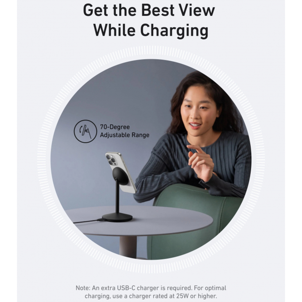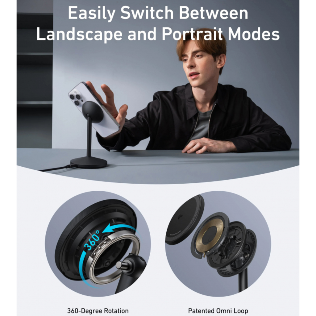 Fedezze fel a gyors és vezeték nélküli töltést az Anker MagGo vezeték nélküli állvány töltővel. 15 W teljesítményű, ez a töltő képes az iPhone 15 Pro-t 0%-ról 30%-ra feltölteni mindössze 24 perc alatt, gyors és hatékony töltést kínálva. Megjegyzés: Ideális laboratóriumi körülmények között tesztelve, a valós töltési idő a használattól és a környezettől függően változhat. Rugalmas nézési szög: Találja meg a tökéletes nézési szöget állítható szögekkel. A töltő lehetővé teszi a függőleges döntést 50 és 70 fok között, valamint 360 fokos vízszintes forgatást, így rugalmasan nézhet tartalmakat vagy tarthat hívásokat, miközben a telefonja töltődik. Kényelmes dizájn: Az Anker MagGo állvány töltő ötvözi a modern dizájnt a praktikus funkciókkal. Könnyen használható, zökkenőmentes töltési élményt nyújt a mindennapi igényekhez igazítva.
