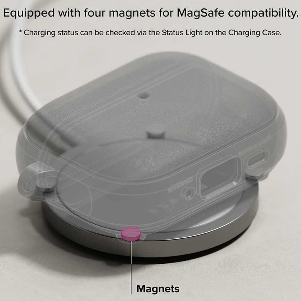 Felejtsd el a bonyolult töltést! A tokba négy beépített mágnes került, amelyek biztosítják a MagSafe töltőkkel való tökéletes kompatibilitást és a stabil illeszkedést. Ez a kialakítás nemcsak kényelmesebb vezeték nélküli töltést tesz lehetővé, hanem garantálja, hogy AirPods Pro 3 készüléked mindig a helyén maradjon a töltőn.