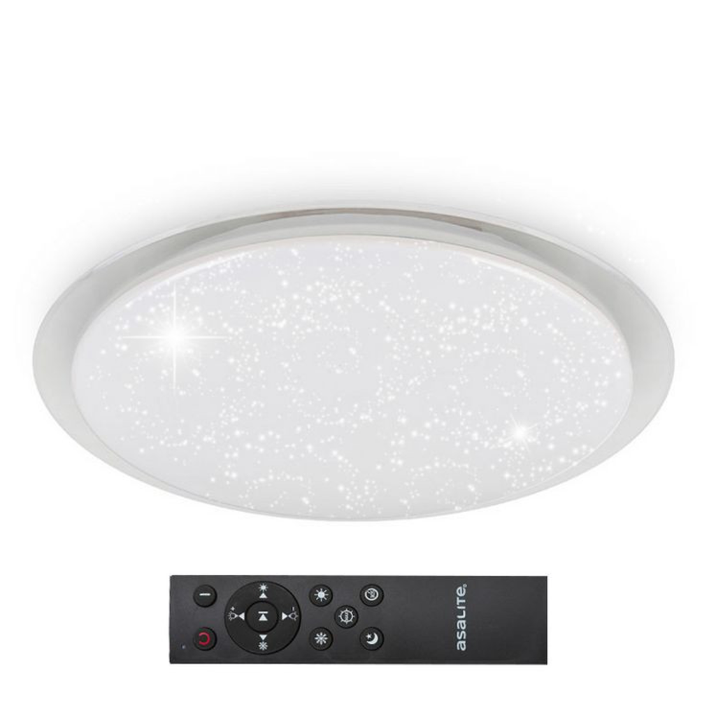 A LED fényforrásokat tartalmazó Asalite LED Mennyezeti Lámpa a jó minőségű és megbízható Led-chipeknek és drivernek, valamint a modern kerek formának és a csillagmintás búrának köszönhetően dekoratív és hosszú távú megoldást jelentenek a lakásának egyenletes, esztétikus és a szemnek is kellemes megvilágítására. A CCT-s (változtatható színhőmérséklet) Mennyezeti Lámpáknak 3000K és 6500K között a színhőmérséklete és a fényereje is egyaránt fokozatmentesen állítható a csomagolásban található távirányítóval.