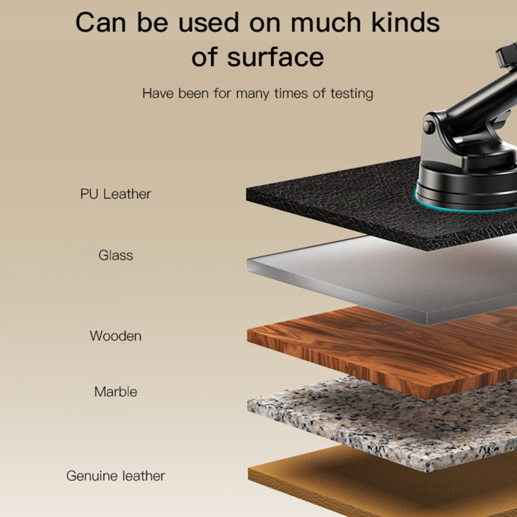 - Erős tapadókorong: Az extra erős tapadókorong nemcsak üvegfelületeken, hanem számos textúrázott felületen is stabilan megállja a helyét, mint például PU bőr, fa, márvány vagy valódi bőr műszerfalak. Tesztelt és megbízható rögzítést biztosít.