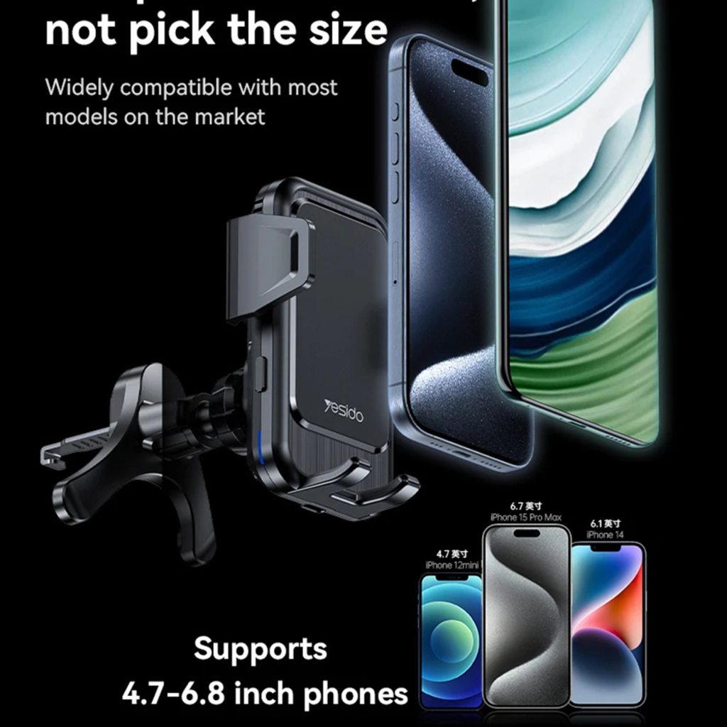 Autós tartó Yesido Vezeték nélküli Töltéssel (C312) - Légbeömlőre, Automatikus Csipesz, Intelligens Indukció, 15W, 4.7 - 6.8inch - Fekete