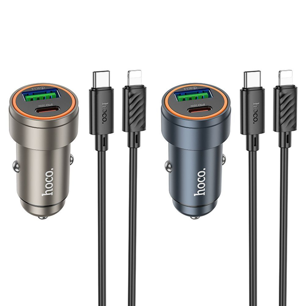 Autós töltő Hoco USB A + USB C QC3.0 PD 30W + kábel USB C-Lightning Z57A fekete