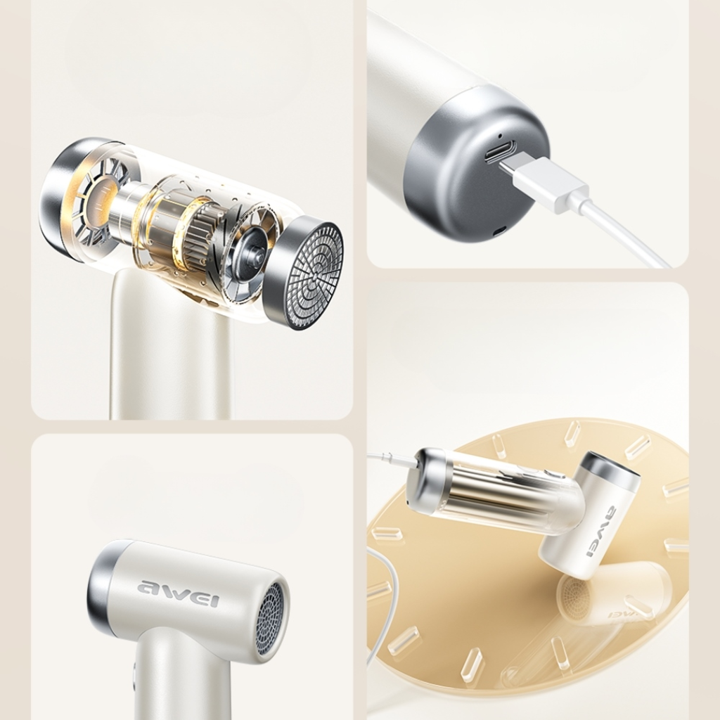 Sebesség és erő egy készülékben: Az AWEI F40 erős kefe nélküli motorral rendelkezik, nagy forgási sebességgel. Az alumínium lapátjainak köszönhetően erős légáramlatot generál, ami a műanyag társaival szemben nagyobb hatékonyságot és hosszabb élettartamot biztosít. Ez lehetővé teszi a készülék számára, hogy számos feladatot elvégezzen - a nehezen elérhető helyek portalanításától kezdve a kisállatok szőrének gyors szárításáig. A többféle üzemmódú magas munkasebesség lehetőséget biztosít a megfelelő beállítások kiválasztására a konkrét felhasználásokhoz, és a konstrukció biztosítja a stabil teljesítményt hosszú távon.