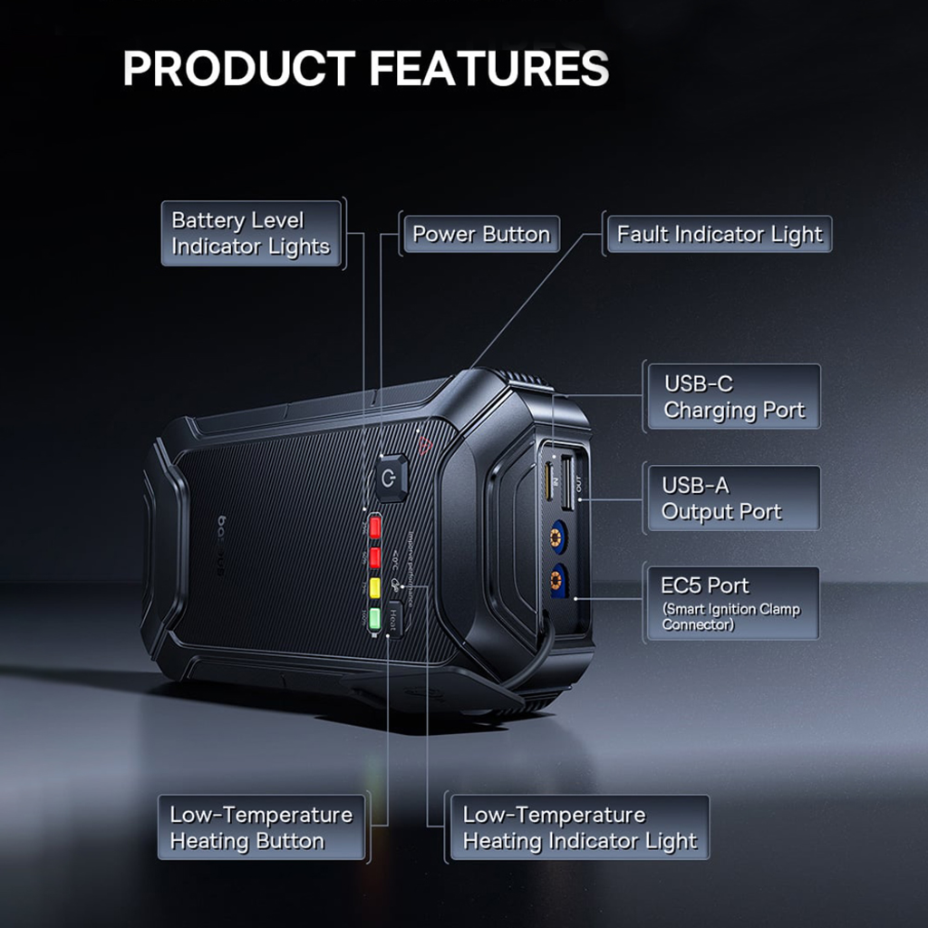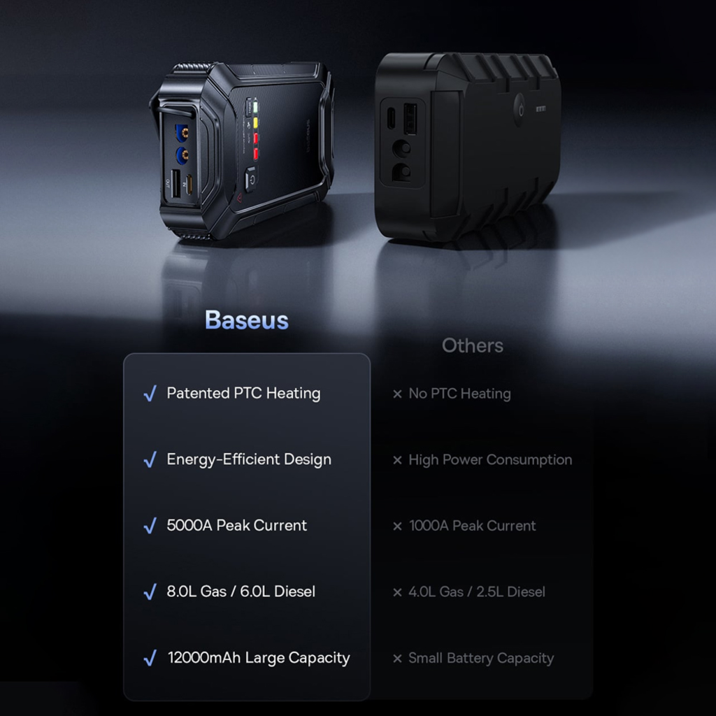 - Megbízható hidegben is: Ne hagyd, hogy a hideg időjárás megállítson! A Baseus PrimeTrip VJ1 szabadalmaztatott PTC fűtési technológiával és dedikált alacsony hőmérsékletű fűtőgombbal rendelkezik, amely garantálja az optimális működést és a problémamentes indítást extrém hideg körülmények között is.