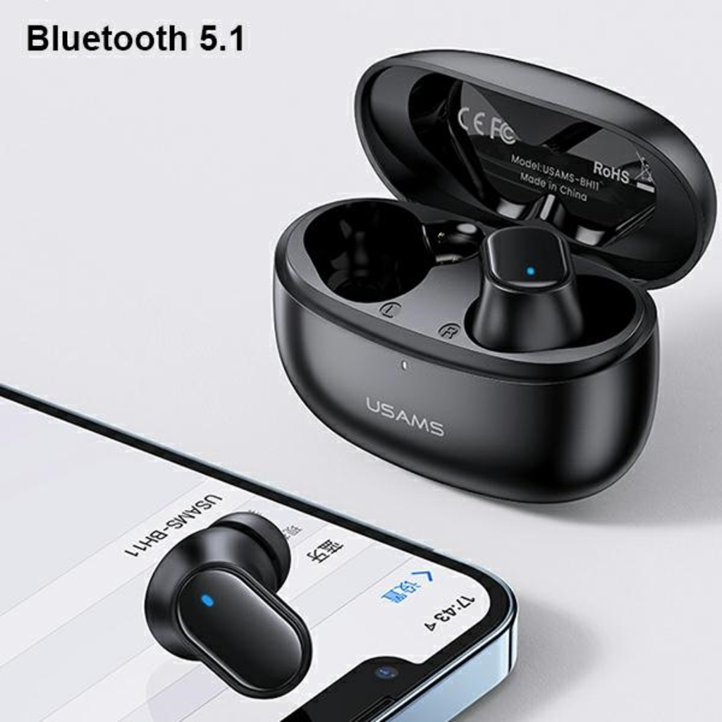 USAMS TWS fülhallgató - BH sorozatú fülbe helyezhető fejhallgató Bluetooth 5.1 technológiával. Az átvitel kétszer olyan gyors, mint a BT 5.0, és a kapcsolat hatótávolsága eléri a 10 métert. Könnyen kezeli a 2.4GHz hálózat interferenciáját. Gyors és stabil kapcsolat alacsony energiafogyasztással. Az akkumulátor lehetővé teszi a folyamatos zenelejátszást 25 órán keresztül, ha az eset töltésével rendszeresen töltjük. Könnyű kialakítás és megfelelő forma biztosítja a kényelmes használatot, és mindössze körülbelül 3.5g-os súlyával szinte észrevehetetlenek. Élvezze a fejhallgató használatának szabadságát — nulla kábel. A beépített zenevezérlő távirányító azt jelenti, hogy nem kell kivenni a telefont, és a beépített mikrofonnal hívásokat is bonyolíthat kedvenc tevékenységei közben vagy vezetés közben.