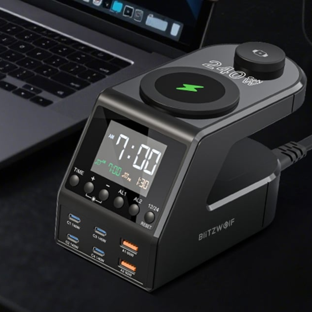 Blitzwolf BW-FW10 ébresztőóra töltővel 2xUSB-A, 4xUSB-C, 240W