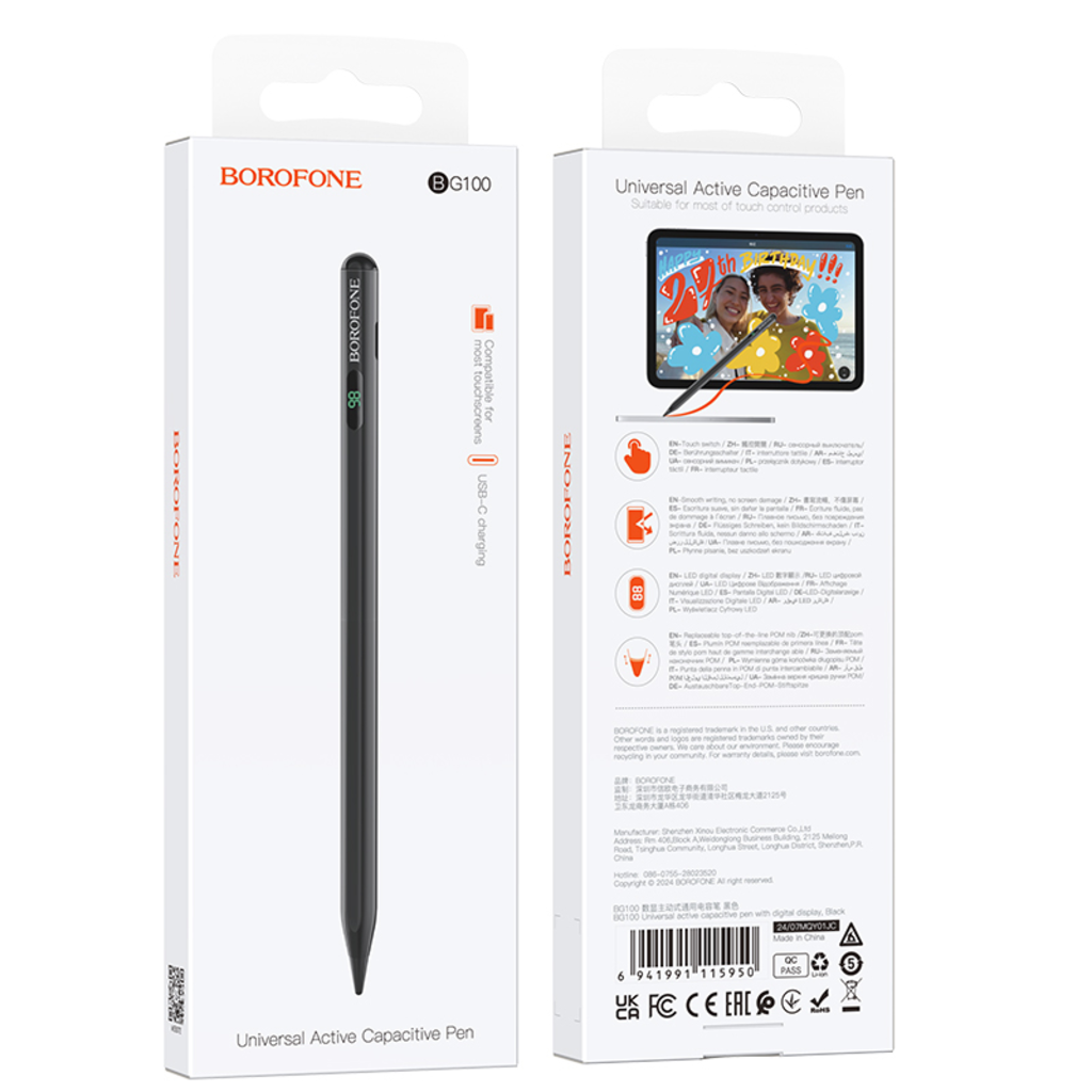 A Borofone Kapacitív Stylus BG100 Univerzális – fekete egy precíz és stílusos stylus, amelyet a legtöbb érintőképernyős okostelefonhoz és tablethez terveztek. Könnyű alumínium ötvözetből készült, cserélhető POM heggyel van ellátva, sima és pontos irányítást biztosít. 130mAh akkumulátorral, digitális teljesítmény kijelzővel, döntött nyomásérzékenységgel, mágneses adszorpcióval és érintésvédelmi technológiával rendelkezik, így ideális művészek, diákok és professzionális felhasználók számára egyaránt.