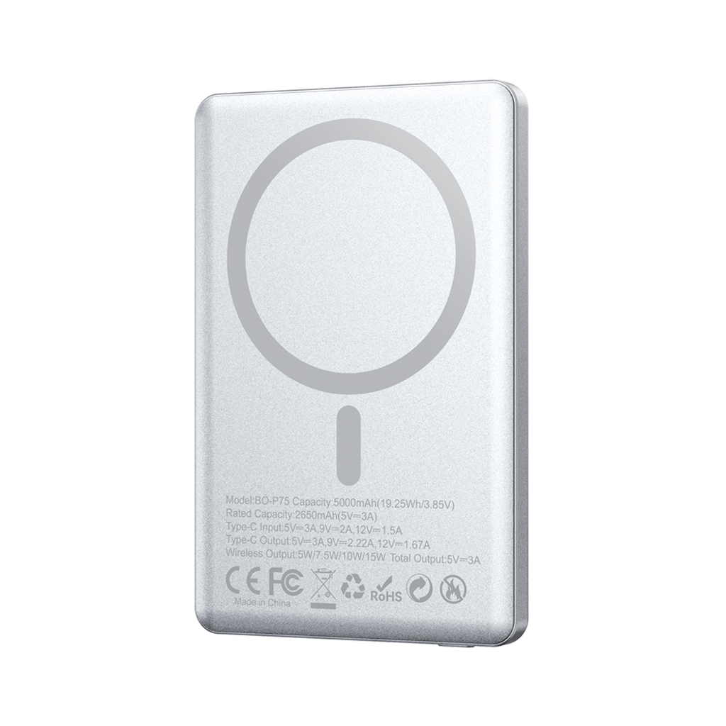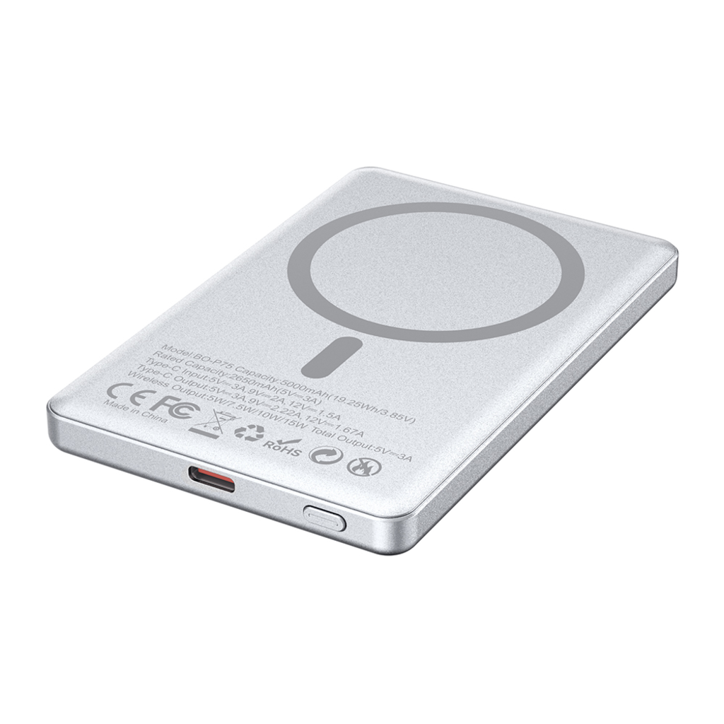 Fedezze fel a BWOO P75 mágneses power bankot, amely tökéletes egyensúlyt teremt a stílus, a hordozhatóság és a nagy teljesítmény között. Az ultra-vékony, mindössze 9 mm vastagságú, elegáns ezüst alumínium ötvözet ház modern és minimalista megjelenést kölcsönöz a készüléknek, miközben rendkívül strapabíró és könnyű. Ideális útitárs, könnyedén elfér zsebében vagy táskájában, biztosítva, hogy soha ne maradjon energia nélkül a mindennapokban vagy utazásai során.