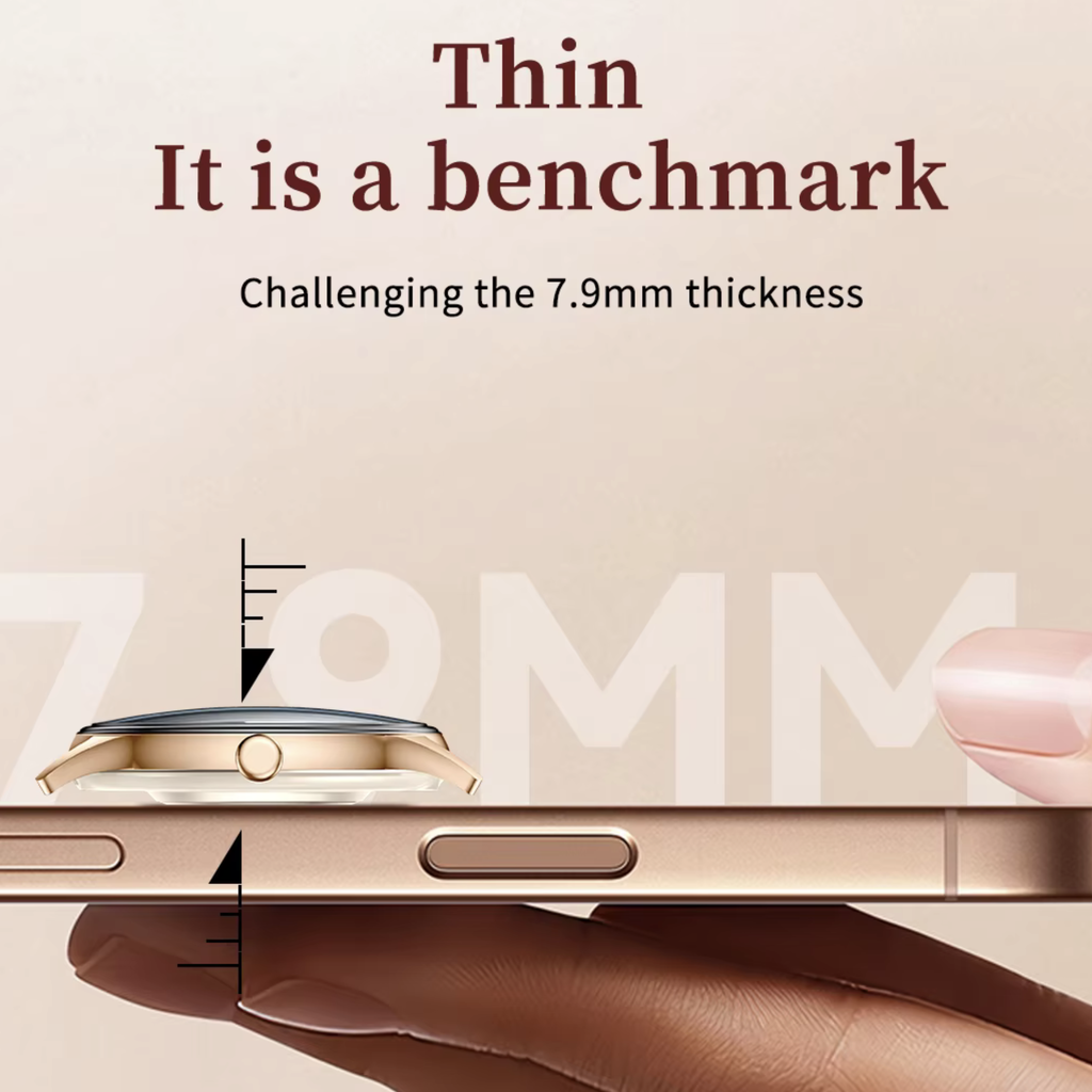 - Prémium anyagok és megjelenés: Az ötvözetből készült tok, a lila szilikon és a bőr szíj kombinációja elegáns és kényelmes viseletet biztosít. A 7.9 mm-es ultra-vékony test és a 3D gömb alakú képernyő igazi vizuális élményt nyújt.