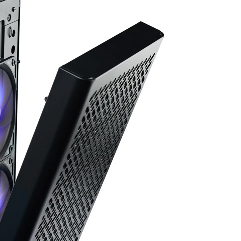 A ház tetején egy I/O panel található egy USB 3.2 Gen1 Type-C porttal, egy USB 3.2 Gen1 Type-A porttal és egy univerzális 3,5 mm-es audiocsatlakozóval. Ez a megoldás garantálja a modern kiegészítők azonnali csatlakoztatását, a kényelmes adatátvitelt és a perifériákkal való zökkenőmentes kommunikációt.