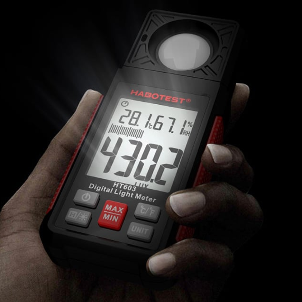 A Habotest HT603 a fényintenzitás mérésére szolgál 0~100000 LUX / 0~10000 FC tartományban. Jól működik például az elektromos iparban vagy helyiség ellenőrzési célokra. Gyors válaszideje és forgatható szondája még kényelmesebbé teszi a használatát. Ezen kívül, a készülékkel mérhetjük a környezeti páratartalmat és hőmérsékletet is. Az HT603-at 3 AAA elemmel lehet működtetni.