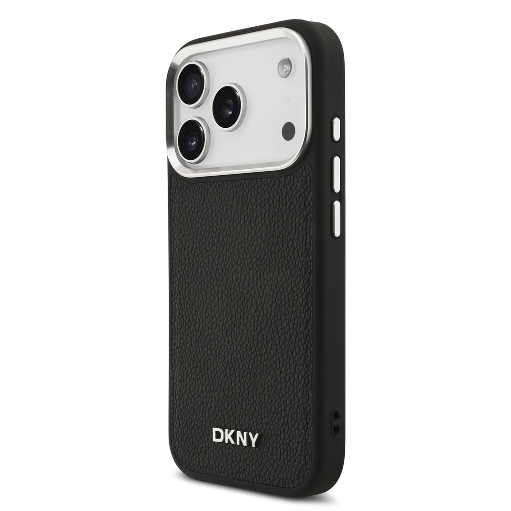iPhone 17 Pro fekete DKNY PU bőrből készült fém logós csuklópántos MagSafe tok