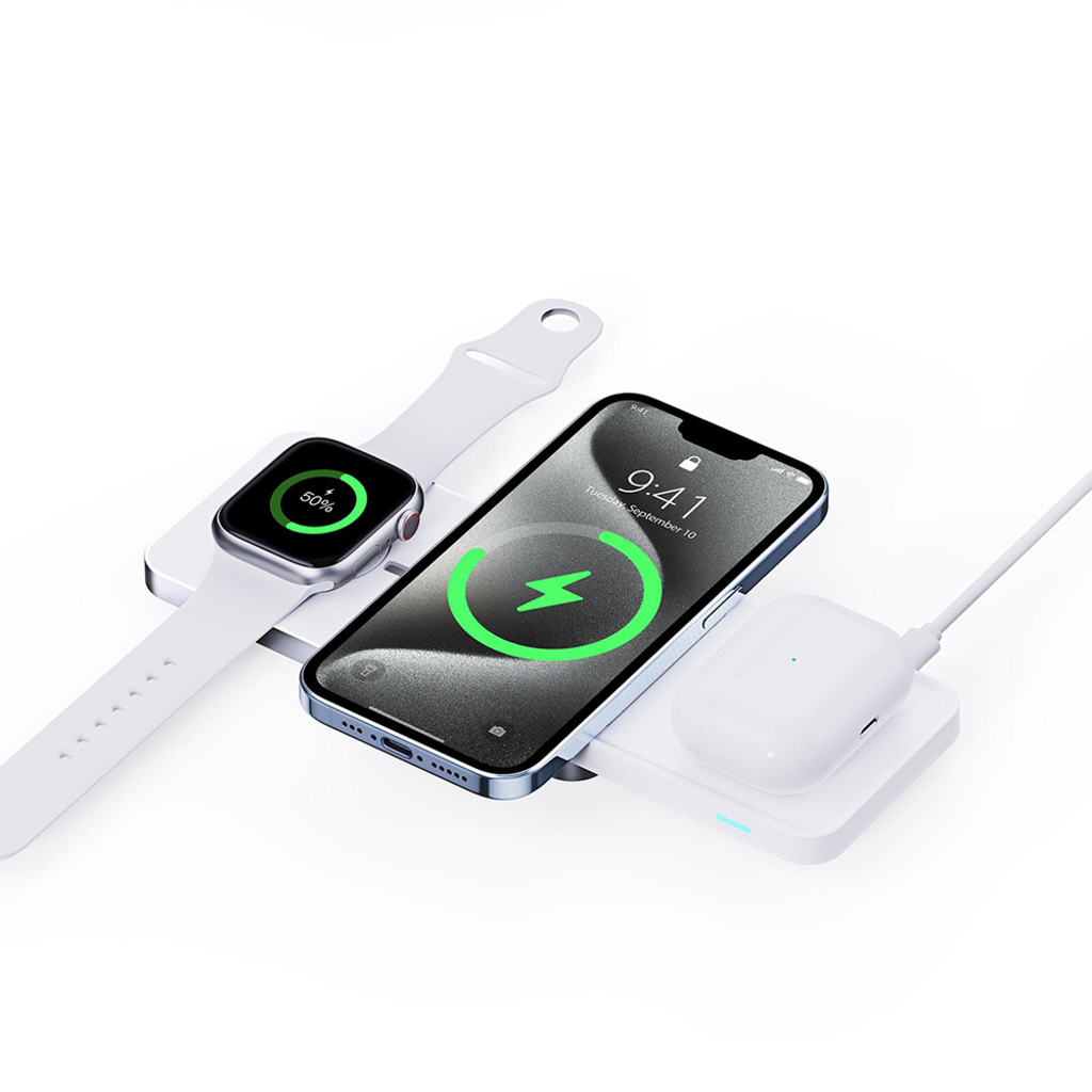 - Univerzális kompatibilitás: Tölthet vele iPhone (MagSafe kompatibilis modellekkel 15W-ig), AirPods fülhallgatót (5W) és Apple Watch okosórát (2.5W) – mindezt egy időben. Mondjon búcsút a kusza kábeleknek és a több töltőnek!
