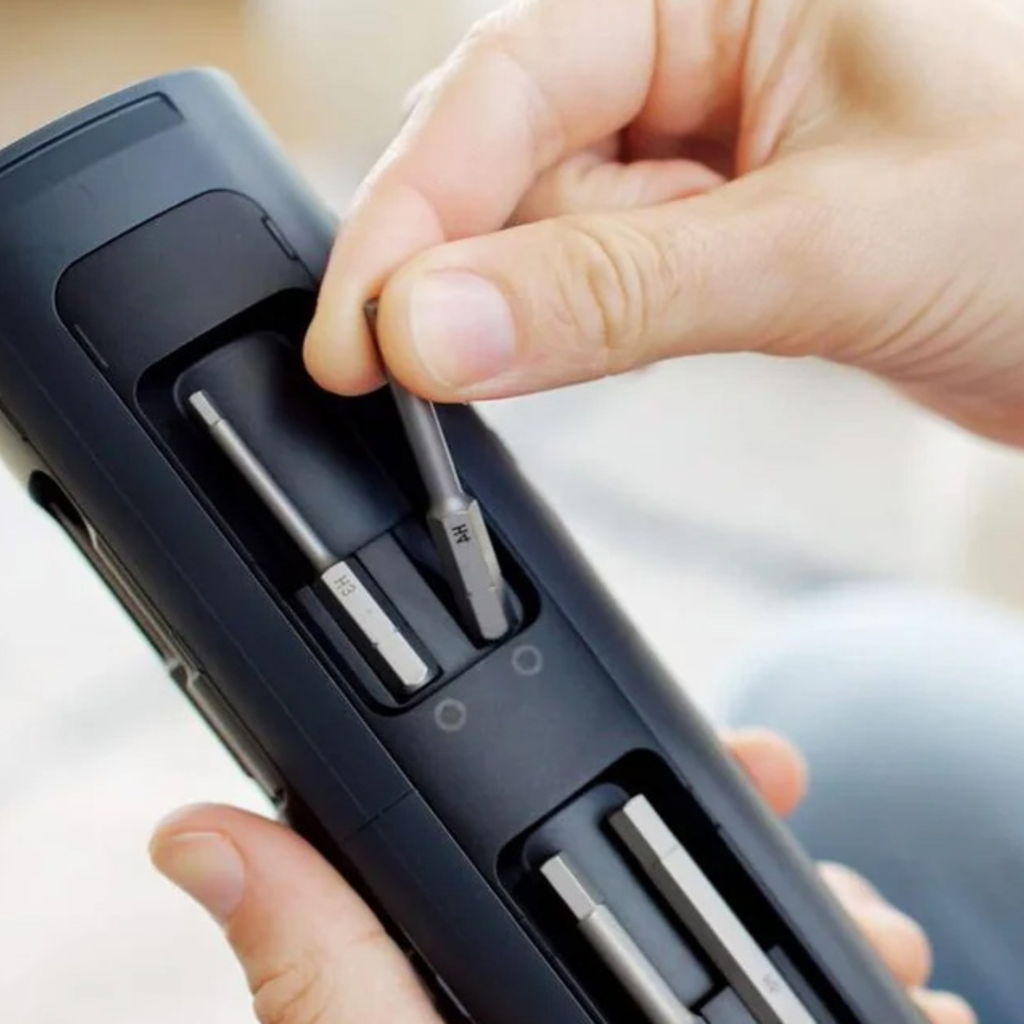 A beépített mágnestartóval ellátott, stabil alumínium tokban a csavarhúzó és a bitek könnyen tárolhatók. A kihúzható mechanizmus gyors hozzáférést biztosít, a markolat és a bitek mágnesezettsége pedig megkönnyíti a biztonságos tartást.