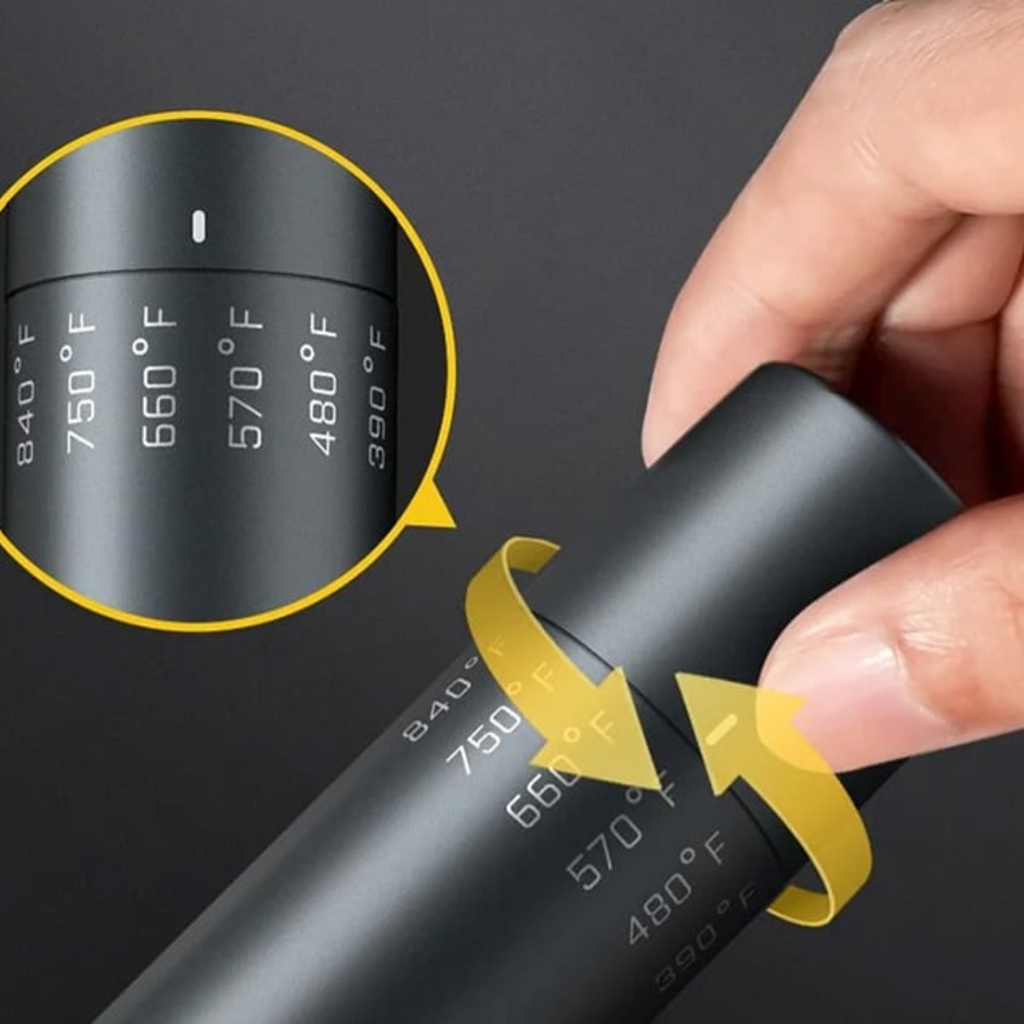 A hátsó gomb segítségével hat hőmérsékletszint közül választhat 200°C - 450°C között, így a különböző alkalmazásokhoz igazíthatja a fűtési teljesítményt, és megvédheti a hőérzékeny alkatrészeket.
