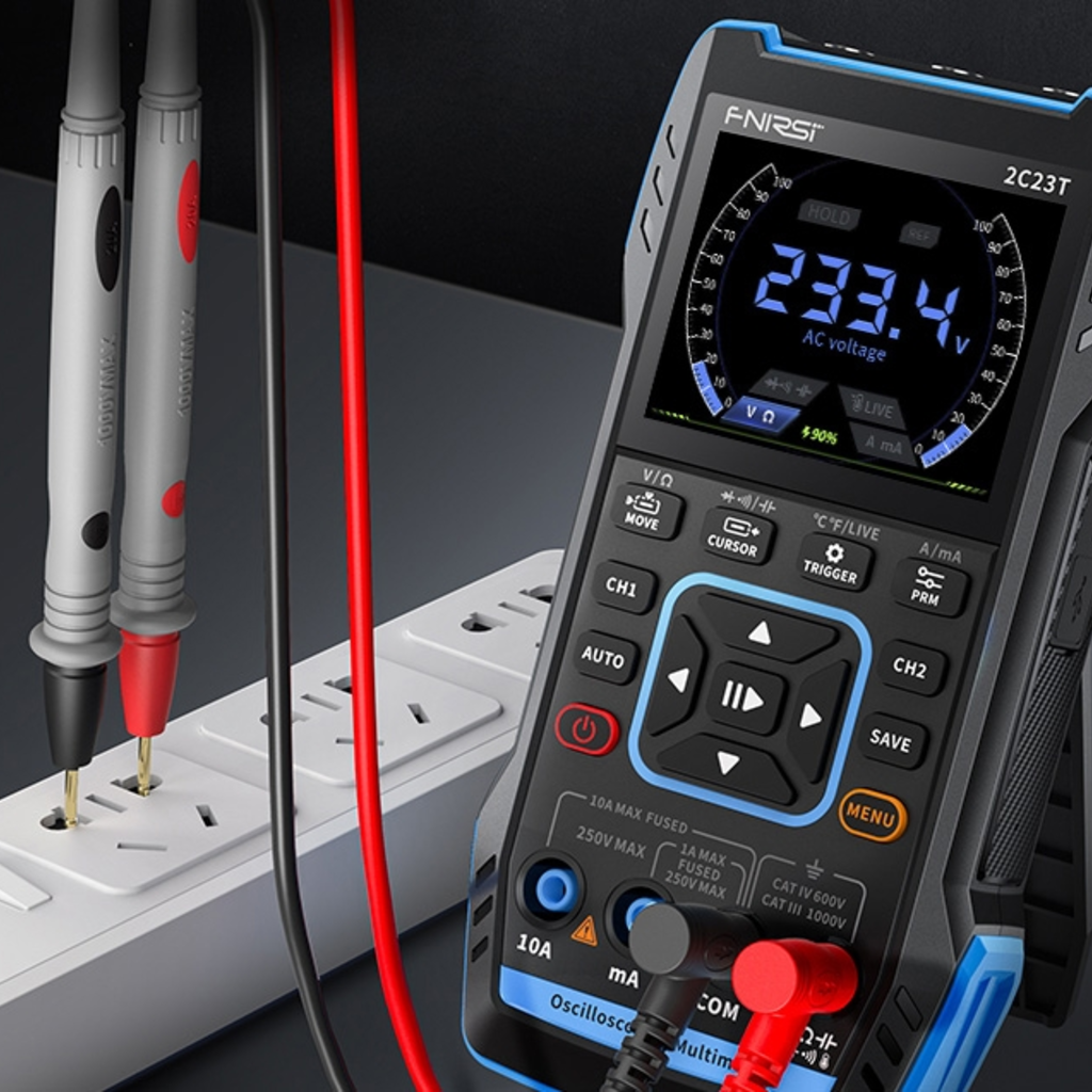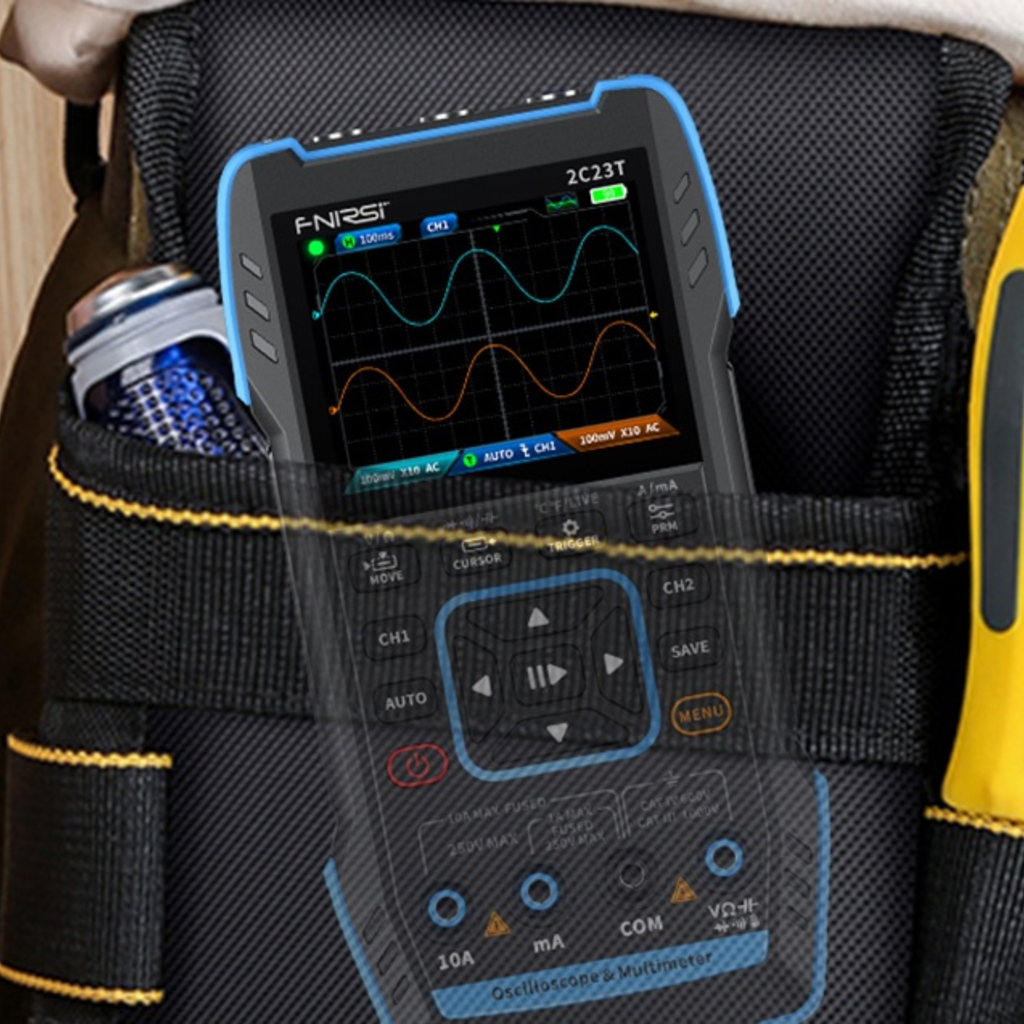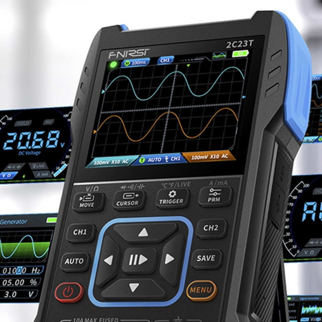 Az FNIRSI 2C23T egy sokoldalú 3 az 1-ben mérőeszköz, amely egyesíti a kétcsatornás oszcilloszkóp, a precíziós multiméter és a jelgenerátor funkcióit. Kompakt kialakításával, intuitív kezelésével és fejlett funkcióival ideális választás mind a professzionális, mind a kezdő elektronikai mérnökök számára. A beépített 3000 mAh-s akkumulátor akár 8 órás üzemidőt biztosít, a 2,8"-os, 320 × 240 px felbontású színes képernyő pedig bármilyen körülmények között kényelmes leolvasást tesz lehetővé.