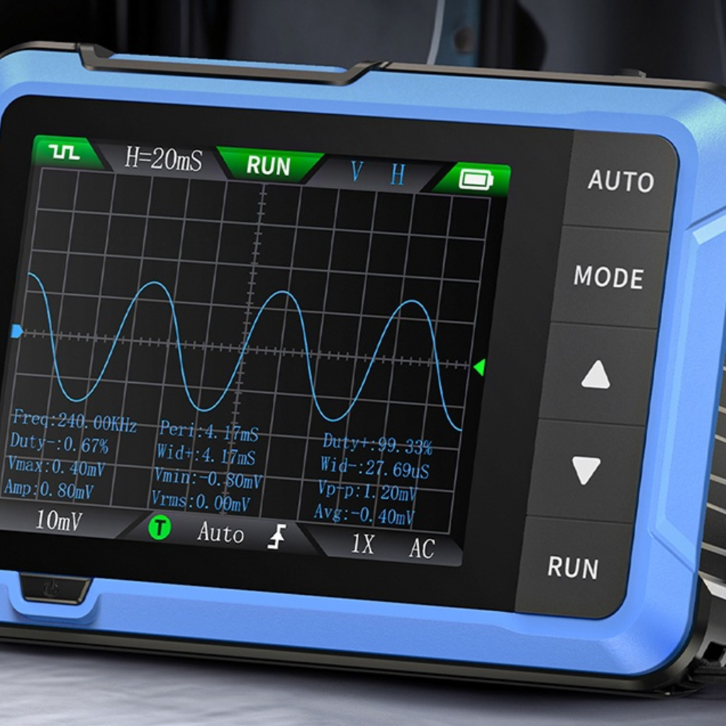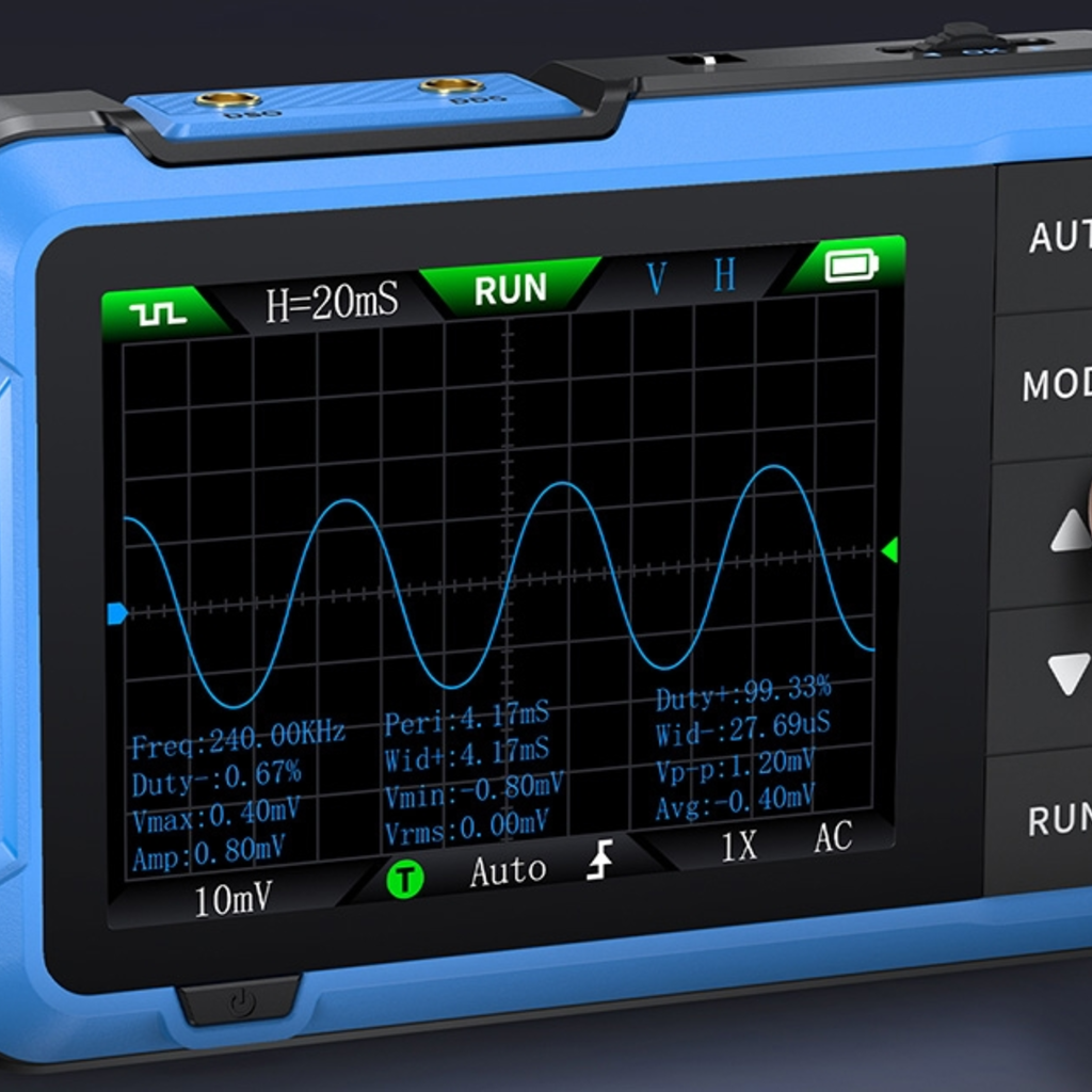 Az FNIRSI DSO510 egy hordozható 2 az 1-ben oszcilloszkóp és jelgenerátor 10 MHz sávszélességgel, amely a kompakt méretet fejlett funkcionalitással ötvözi. A készülék olyan intelligens funkciókat kínál, mint az automatikus beállítás, a túlfeszültség elleni védelem, a trigger szint kijelzése és a képfelvételi lehetőség. Állítható fényerejével lehetővé teszi a tranziensek hatékony követését, és támogatja a hullámformák megállítását, nagyítását és pásztázását a pontos elemzés érdekében. A beépített generátor 13 hullámformát kínál, támogatva a tanulást és a tesztelést. A kompakt méret és az összecsukható állvány bármilyen környezetben kényelmet biztosít. A készülék jól működik a hálózati feszültség, a tápegység hullámzásának és más hullámformák mérésére. A hosszú üzemidőt az USB-C porton keresztül töltött 1000 mAh-s akkumulátor garantálja. Kiváló választás mind a szakemberek, mind az elektronika szerelmesei számára.