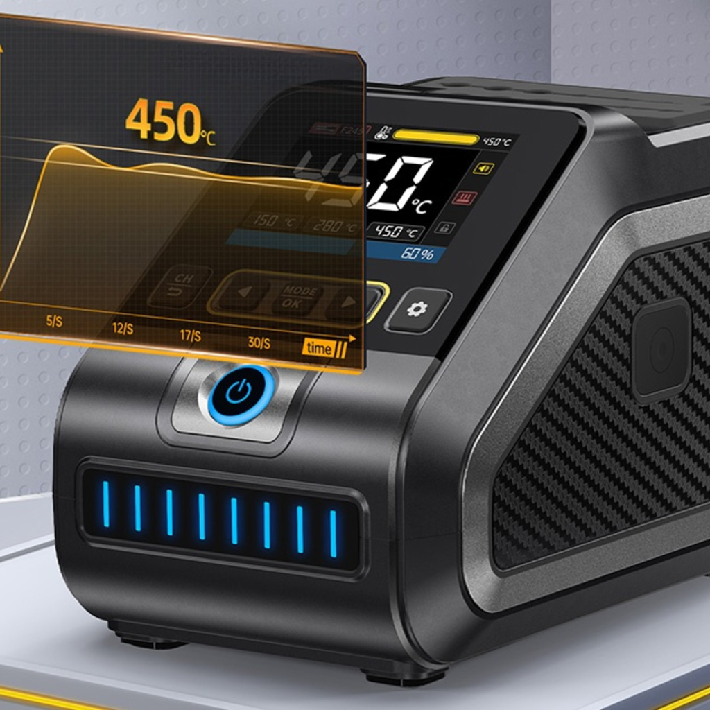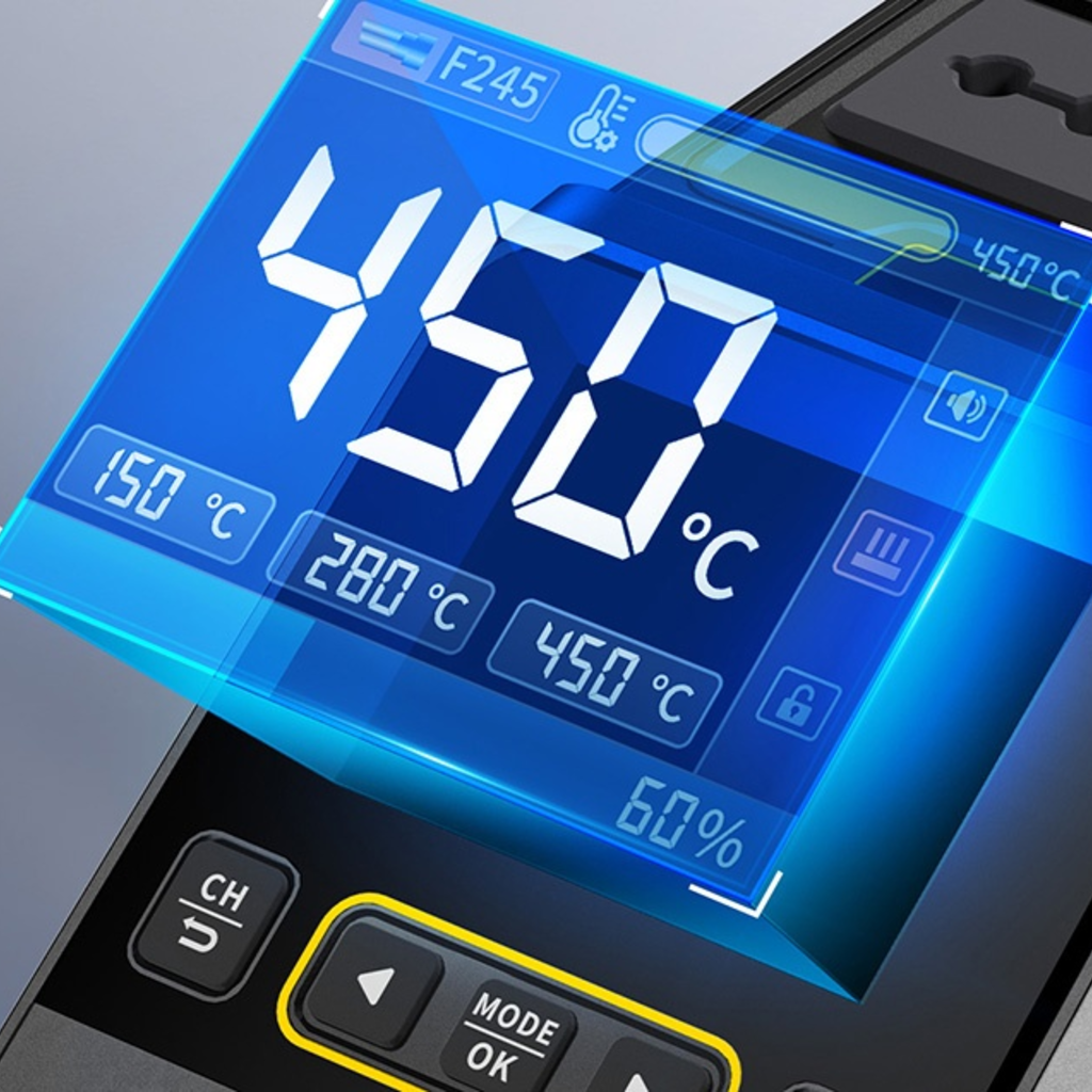 Széles körű kompatibilitás és teljesítménystabilitás Az állomás támogatja az F210 és F245 tartókat is - könnyedén válthat közöttük az adott munkától függően. A széles feszültségtartománynak (100-240V) és a tiszta réz transzformátornak köszönhetően az egység stabilan működik a legkülönbözőbb áramellátási körülmények között, így ideális választás a felhasználók számára világszerte. Az intelligens PID-rendszer stabil hőmérséklet-szabályozást tesz lehetővé 100°C és 450°C között. Az állomás gyors fűtési (mindössze 1 másodperc) és olvadási (3 másodperc) idővel is rendelkezik, emellett akár 200 W-os teljesítményt kínál a még pontosabb működés érdekében.
