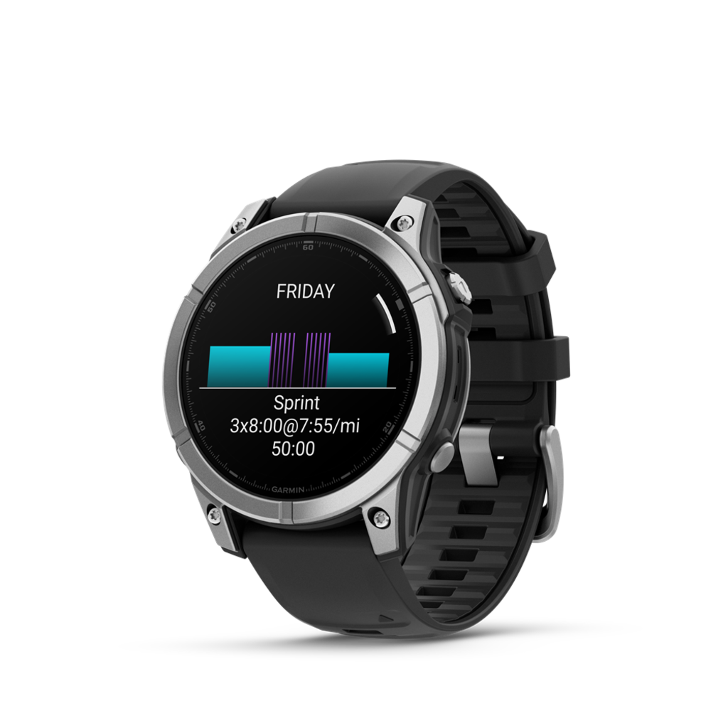 - Multisport teljesítménymérés: Optimalizáld edzéseidet a fenix E segítségével. Kövesd nyomon sportteljesítményedet részletes adatokkal, legyen szó sprint edzésekről vagy hosszútávú kihívásokról. Az óra képes strukturált edzéseket is megjeleníteni és vezetni, például "Sprint 3x8:00@7:55/mi" (a képen látható edzésterv). Az integrált optikai pulzusmérő (a hátlapon látható) folyamatosan figyeli szívverésedet a még pontosabb edzésadatokért.