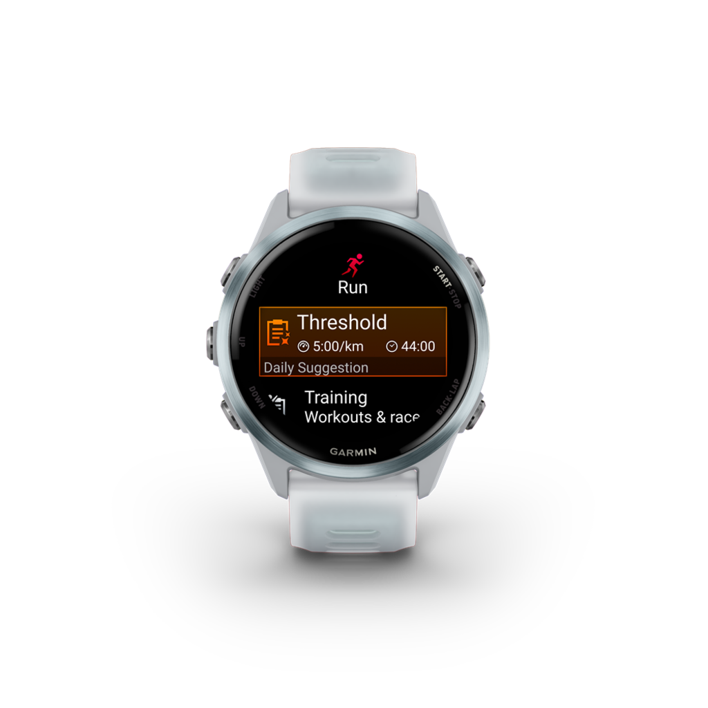 - Személyre szabott edzésjavaslatok: A Forerunner 570 naponta javasol számodra edzéseket, figyelembe véve az aktuális edzettségi szintedet és regenerációdat. Legyen szó küszöbedzésről (például 5:00/km tempó 44 percig) vagy általános futásról, az óra mindig a megfelelő kihívást kínálja, segítve az optimális fejlődést.
