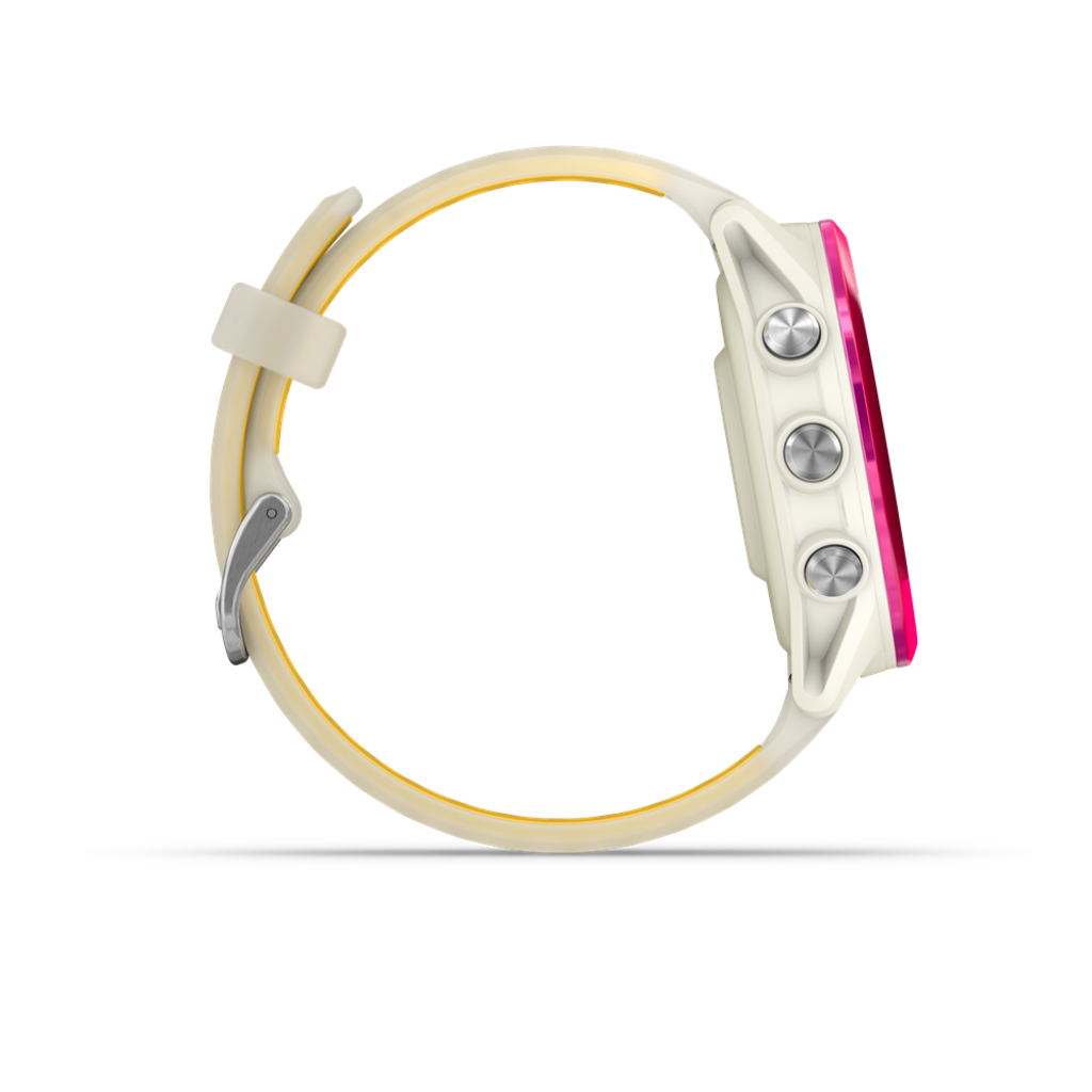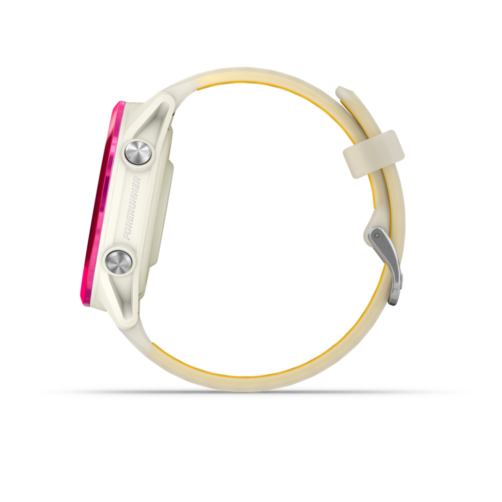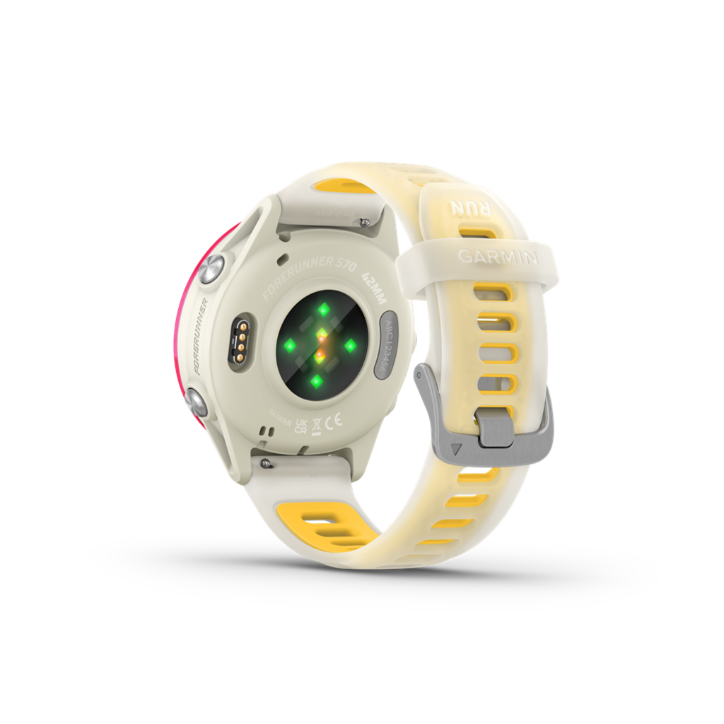 - Kiemelkedő dizájn: A 42mm-es, fehér óratokkal, a merész málna színű kijelző kerettel és a kéttónusú fehér-sárga szíjjal a Forerunner 570 nem csak okos, de divatos kiegészítője is lesz megjelenésednek.