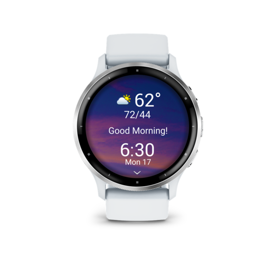 A Garmin Venu 3 lenyűgöző AMOLED kijelzője élénk színekkel és kristálytiszta részletekkel jeleníti meg az információkat. Reggel ébredve egy pillantással ellenőrizheti az időt (pl. 6:30), a dátumot (hétfő, 17.), az aktuális időjárást (mint például a 62°F, 72/44 értékeink), és személyre szabott üdvözleteket kaphat, amelyekkel pozitívan indulhat a napja.