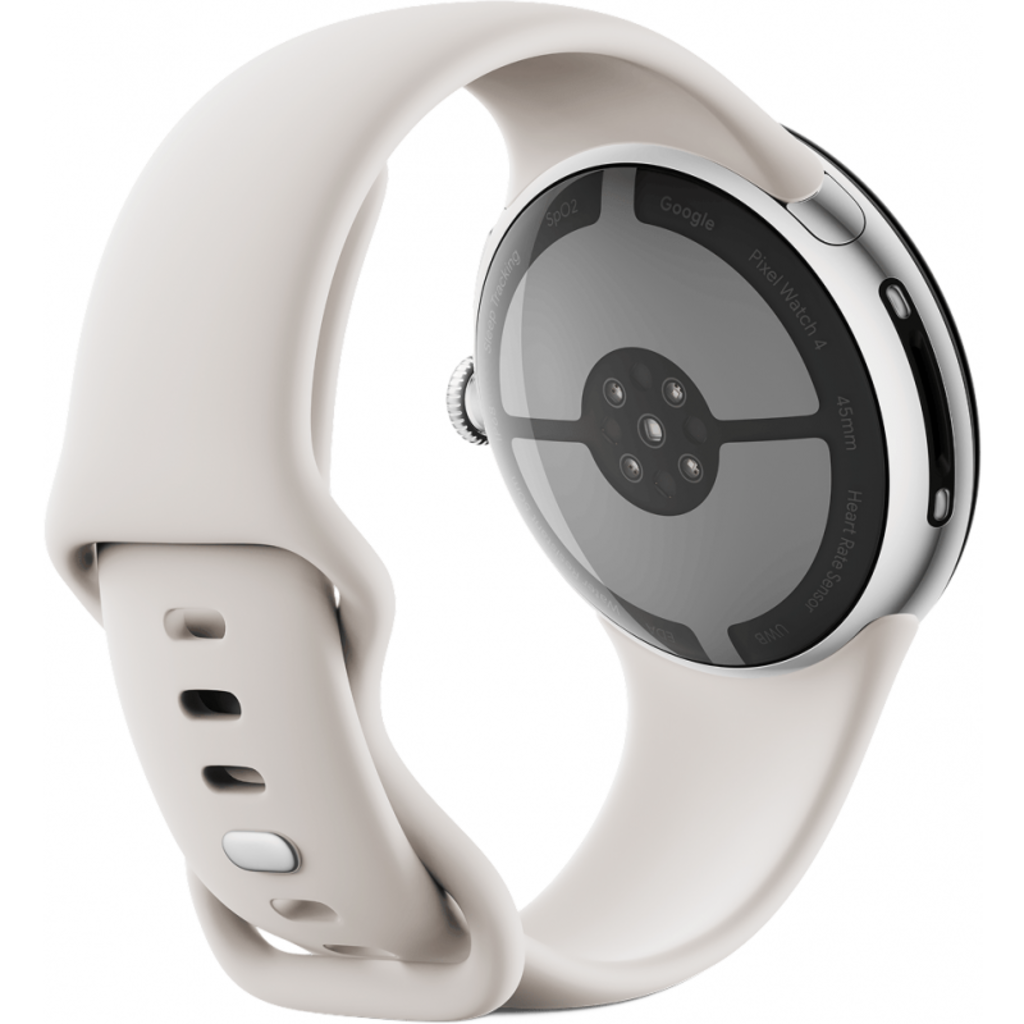 A Google Pixel Watch 4 letisztult és minimalista esztétikája azonnal magával ragad. A 45 mm-es, gondosan megmunkált, polírozott ezüst rozsdamentes acél tok, a lágyan ívelt, domború üveg és a porcelán színű, puha tapintású szilikon szíj együttesen biztosítják a prémium megjelenést és a kivételes viselési kényelmet. A diszkréten elhelyezett forgatható korona és oldalsó gomb intuitív vezérlést tesz lehetővé, míg a szabadalmaztatott szíjmechanizmus garantálja a zökkenőmentes illeszkedést és a könnyed cserélhetőséget.