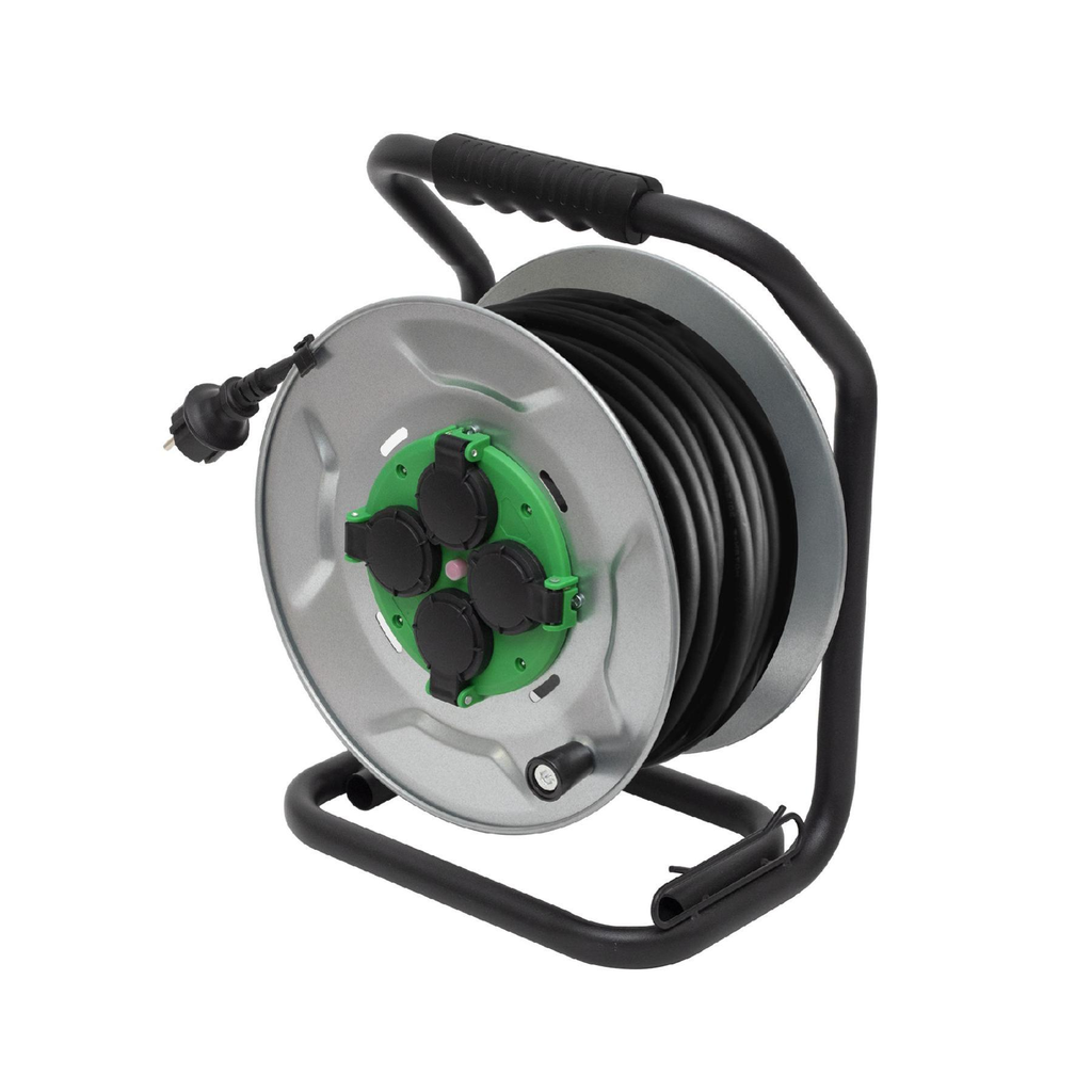 HOME HJRM2025 fém kábeldob, 25 méter, fém talp, H07RN-F 3G2,5 mm2 vezeték, 250 V~ / max. 16 A, túlmelegedés elleni védőkapcsolóval