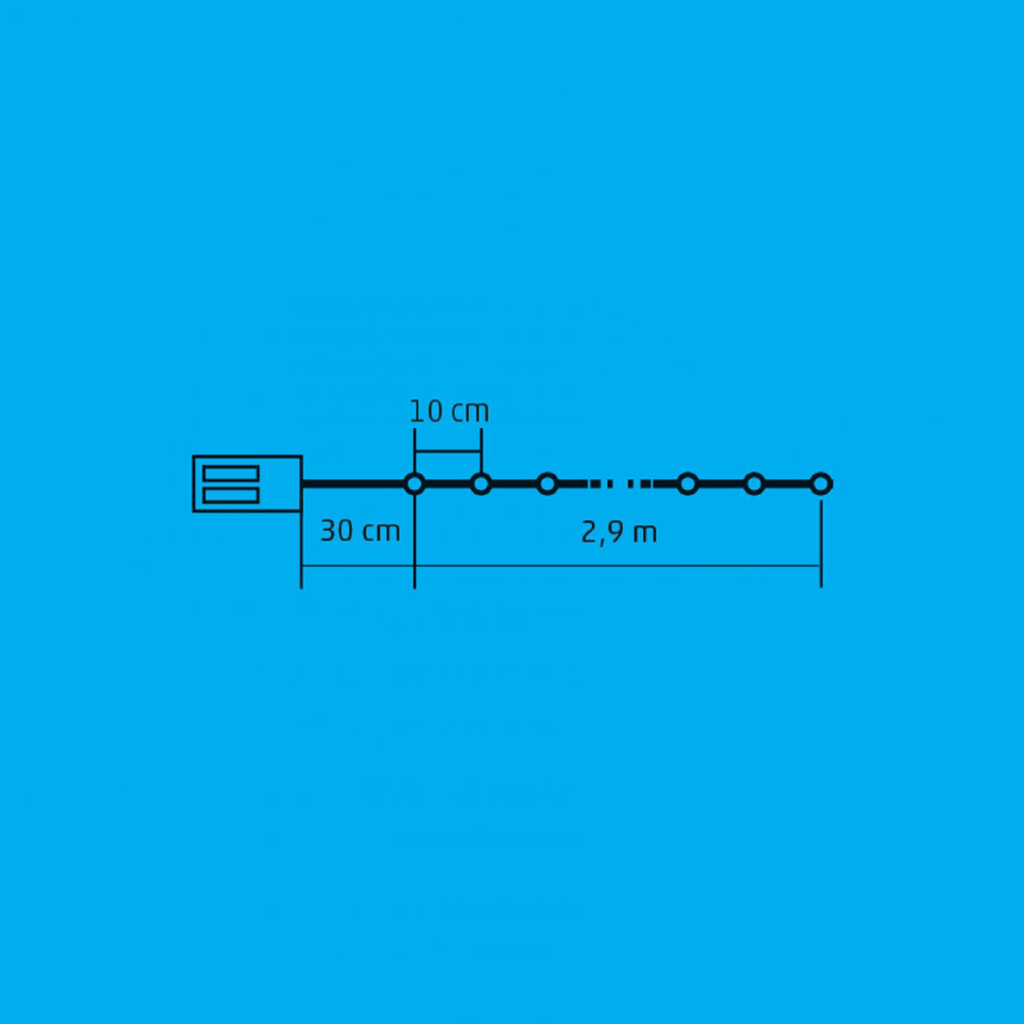 Az ML 30/M pont ezt kínálja: egy beltéri fényfüzér 30 db színes micro-LED-del, amelyek mindegyike fényesen ragyogó, pontszerű fényt bocsát ki.