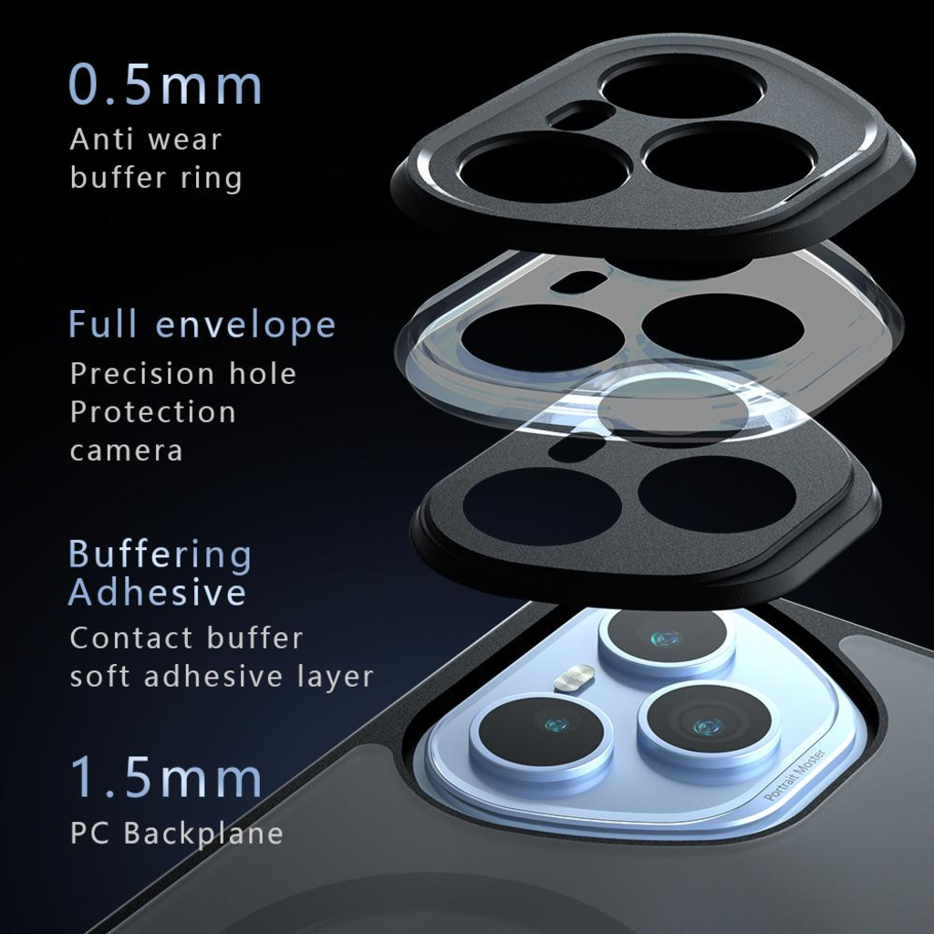 - Kijelző és kamera teljes körű védelme: A tok 0.5 mm-rel megemelt élekkel rendelkezik a kijelző körül, megakadályozva a közvetlen érintkezést a felületekkel. A kamerák biztonságát egy 0.5 mm-es kopásálló puffergyűrű, precíziós lyukakkal ellátott teljes lefedés, egy speciális pufferelő ragasztóréteg és egy 1.5 mm vastag PC hátlap biztosítja.