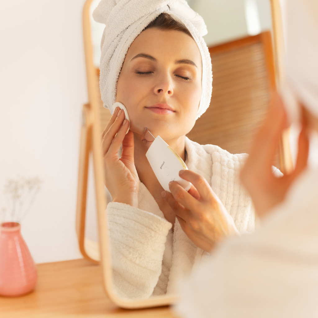 - Tisztítás: a kavitációs folyamat révén az eszköz hatékonyan tisztítja a pórusokat a szennyeződésektől és a felesleges faggyútól, segítve a bőrproblémák megelőzését és az arcbőr jó állapotban tartását.