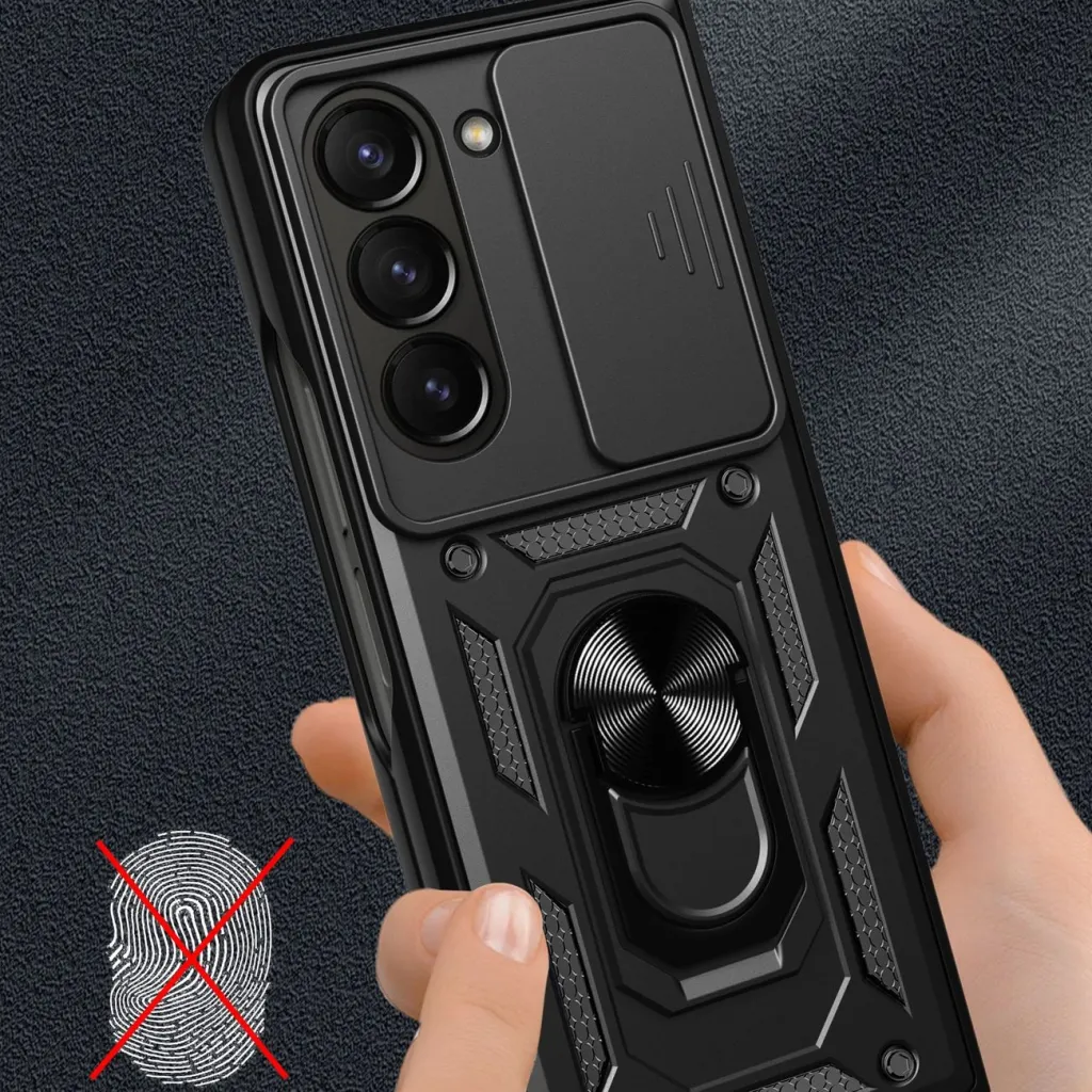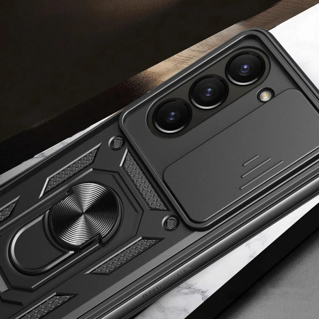Páncélozott tok Hybrid Armor Camshield, Z Fold 5 5G-hez kamerafedéllel - fekete A Hybrid Armor Camshield sorozatból származó páncélozott tok termoplasztikus és tartós anyagból készült, amely megjelenésében acélt imitál. A tok tökéletesen illeszkedik a készülékhez, és védi a telefont az esések vagy karcolások okozta károktól (pl. zsebben hordott kulcsok által). A tok csúszó fedelet tartalmaz a hátsó kamerához. Ennek köszönhetően a kamera üvege védett a karcolások ellen. Továbbá, ez egy extra előny azoknak, akik értékelik az adatbiztonságot és a magánéletet. A lefedett kamera megakadályozza a videofelvételhez való hozzáférést, ha valaki távolról hozzáférne a telefonhoz, és bekapcsolná a főkamerát. A képernyő körüli emelt élek megvédik azt, amikor egy sík felületre teszik. Beépített fémgyűrűje lehetővé teszi a telefon egykezes kényelmes használatát, és állványként is szolgál. A beépített fémlemez lehetővé teszi, hogy mágneses autós tartókhoz csatlakoztassa. Reagáló gombokkal és portkivágásokkal rendelkezik. Tökéletes választás azoknak, akik értékelik a stílust, a minőséget és gondoskodni szeretnének készülékükről. Specifikáció: - Sorozat: Hybrid Armor Camshield