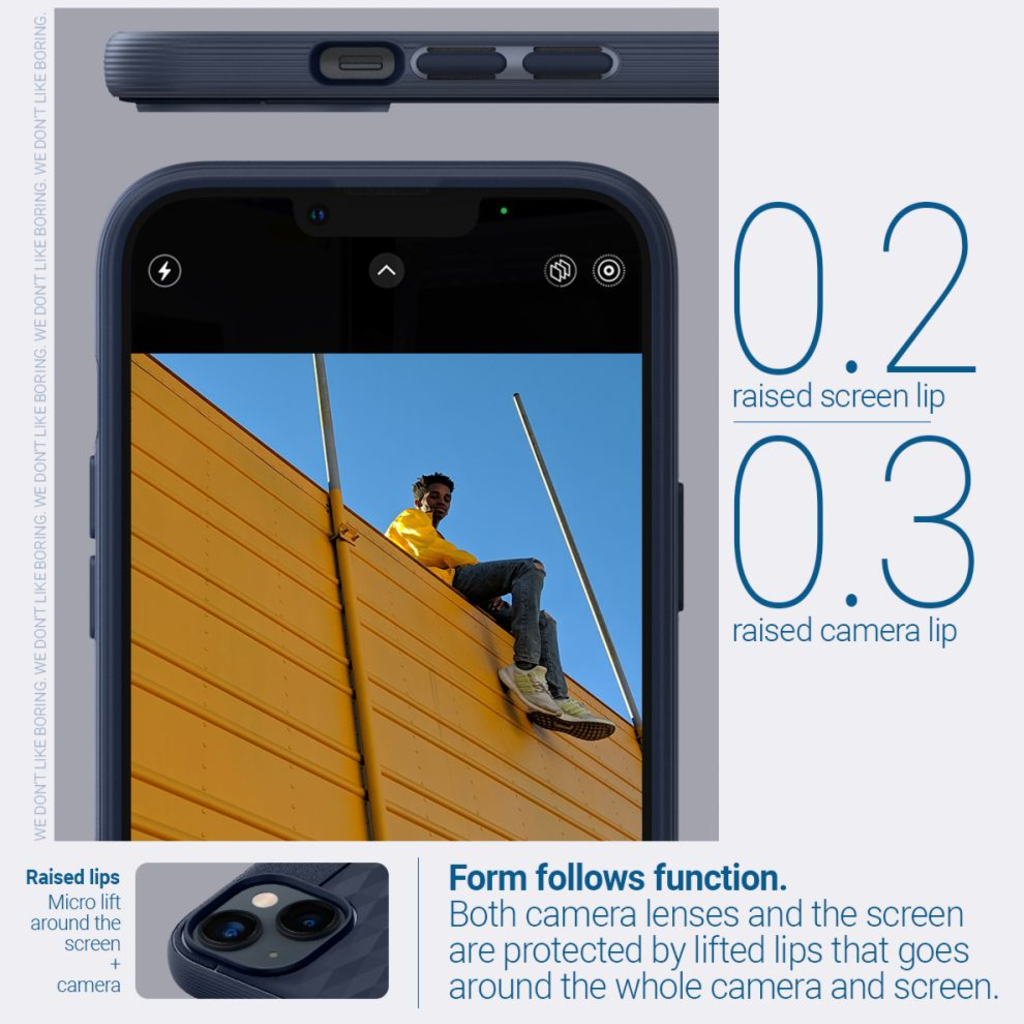 - Megemelt szélek: A képernyő és a kamerák körül finoman megemelt ajkak további védelmet nyújtanak. A 0.2mm-es perem a kijelző, és a 0.3mm-es perem a kamera lencsék körül megakadályozza, hogy azok közvetlenül érintkezzenek sík felületekkel eséskor, vagy amikor lerakod a telefont.