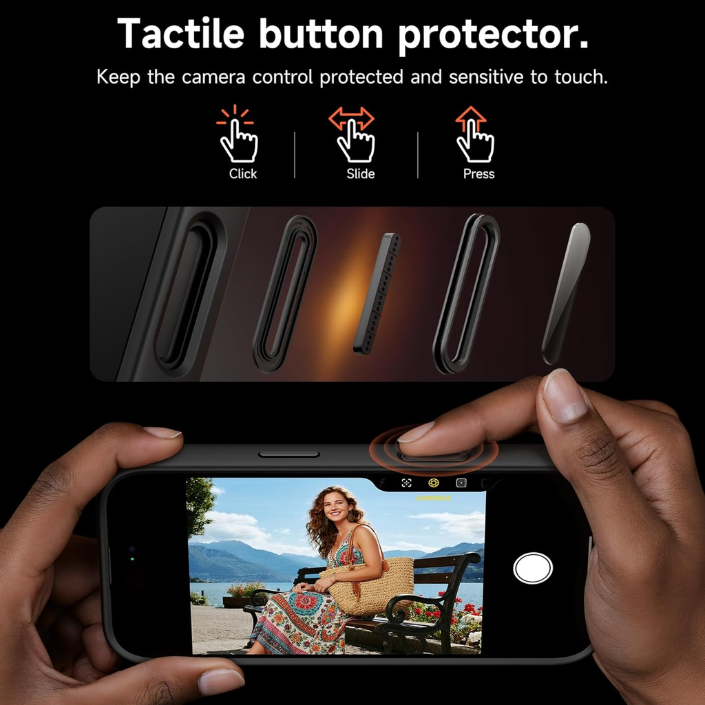 A tok precízen kialakított, tapintásra érzékeny gombvédői biztosítják, hogy a telefon gombjai továbbra is tökéletesen reagáljanak minden kattintásra, csúsztatásra és nyomásra. A kameravezérlők védelme mellett megőrzik azok eredeti érzékenységét, így Ön akadálytalanul használhatja készülékét anélkül, hogy le kellene mondania a védelemről.