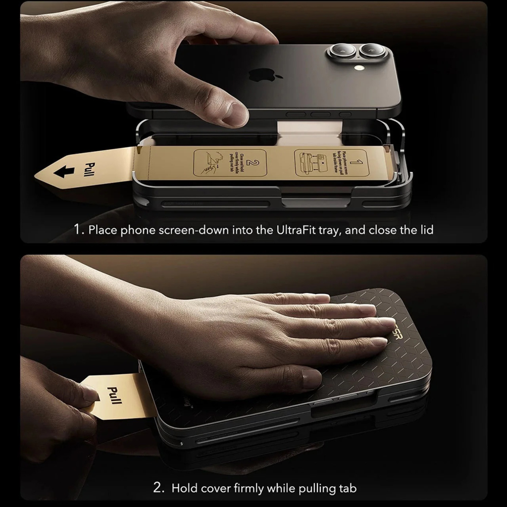 - ESR UltraFit telepítő keret: Felejtse el a buborékokat és a rossz illeszkedést! Az innovatív UltraFit tálca és a "Pull" fül segítségével a felhelyezés egyszerűbb, mint valaha. Helyezze a telefont kijelzővel lefelé a tálcába, zárja le a fedelet, majd határozottan tartva a fedőt, húzza meg a fület – és már kész is!