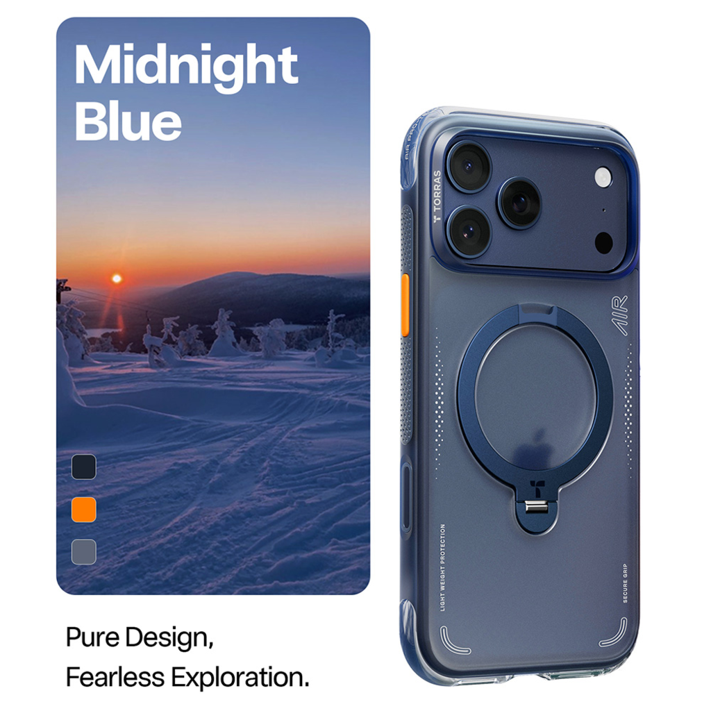 Válaszd a Torras Ostand Spin Air Series tokot, és élvezd az iPhone 17 Pro készüléked által nyújtott szabadságot maximális védelemmel és páratlan funkcionalitással az Éjféli Kék eleganciájával!