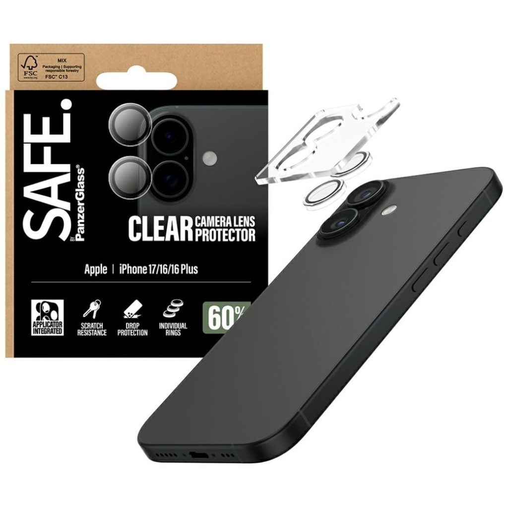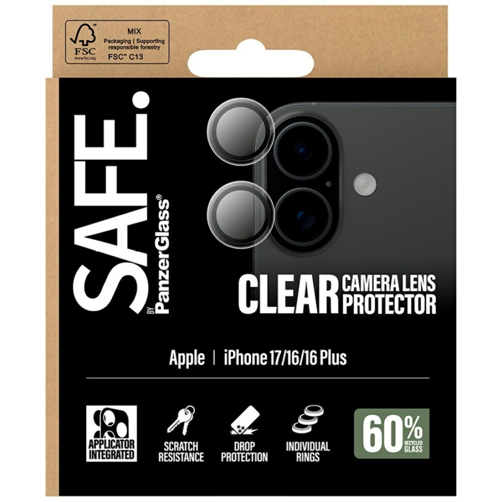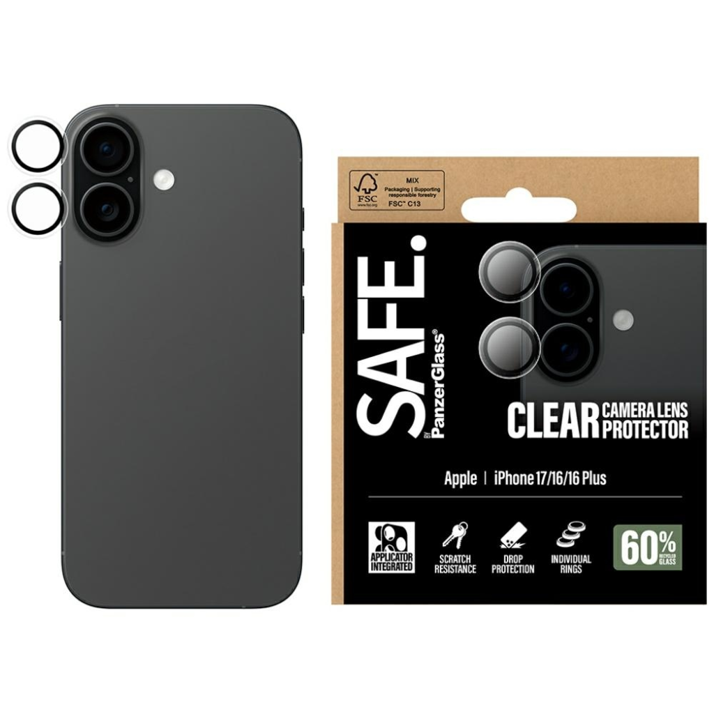 A SAFE. by PanzerGlass® kamera objektívvédő a tökéletes módja annak, hogy megóvjuk telefonunkat a karcolásoktól, ütésektől és véletlen leejtésektől. A vékony, átlátszó gyűrűk tökéletesen illeszkednek az iPhone dizájnjához, nemcsak védelmet nyújtva, hanem finom stílust is adva. A 60%-ban újrahasznosított edzett üvegből készült konstrukciónak köszönhetően objektíveink védettek maradnak, így magabiztosan megörökíthetjük életünk minden fontos pillanatát.
