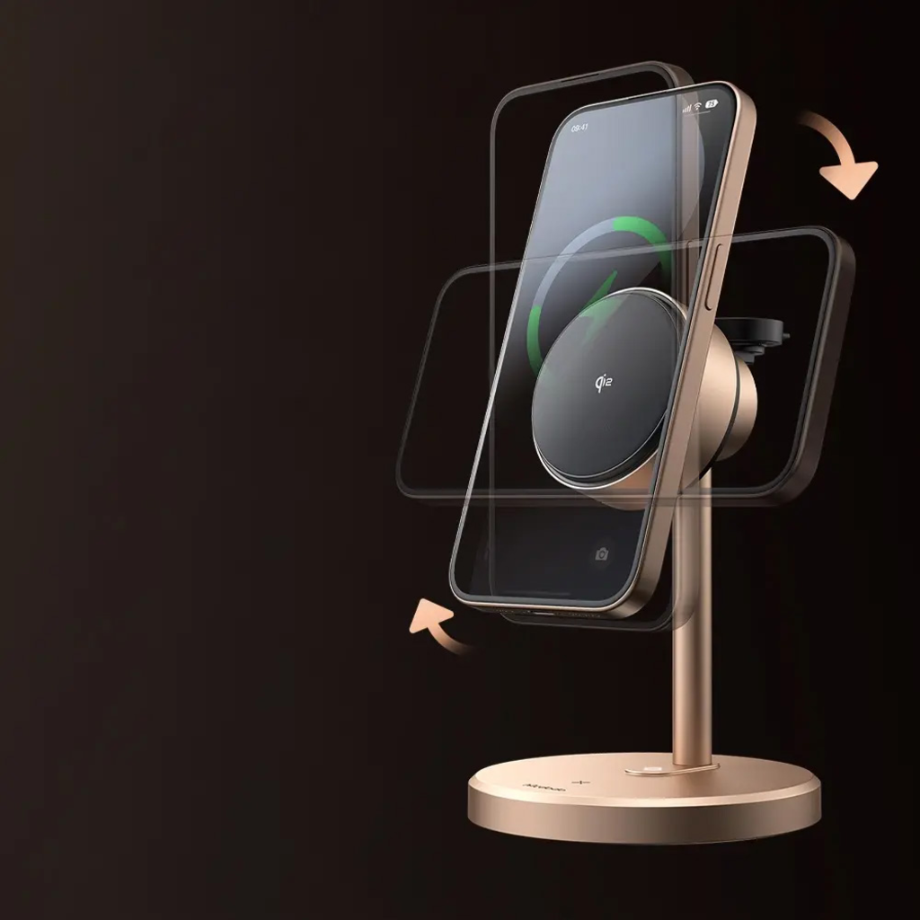 - Állítható és forgatható kialakítás: Az iPhone töltőfelülete szabadon forgatható 360°-ban, így könnyedén válthat álló és fekvő tájolás között, videóhívásokhoz, filmnézéshez vagy értesítések ellenőrzéséhez.
