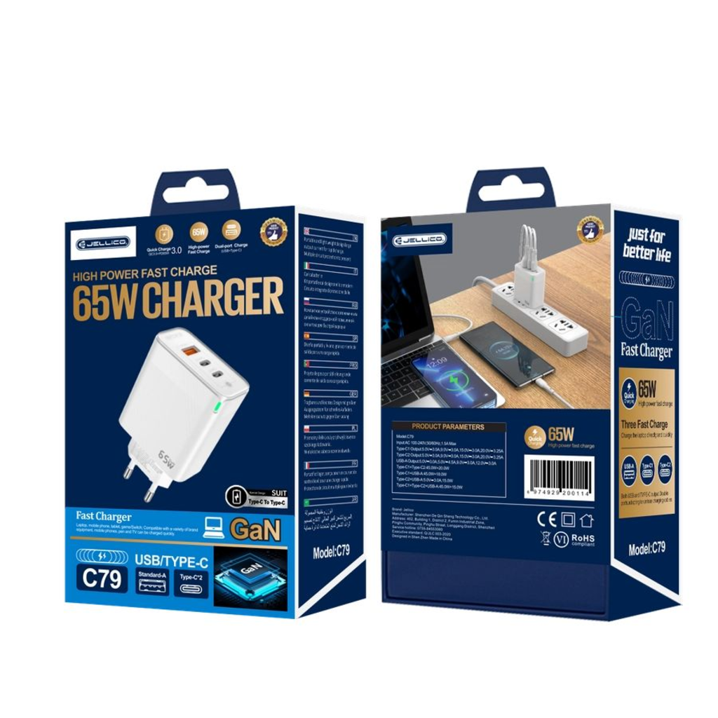 JELLICO fali töltő C79 GaN PD 65W 2xUSB-C + 1xUSB QC3.0 + kábel USB-C - USB-C Fehér