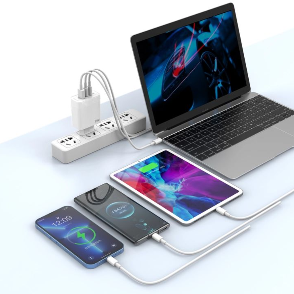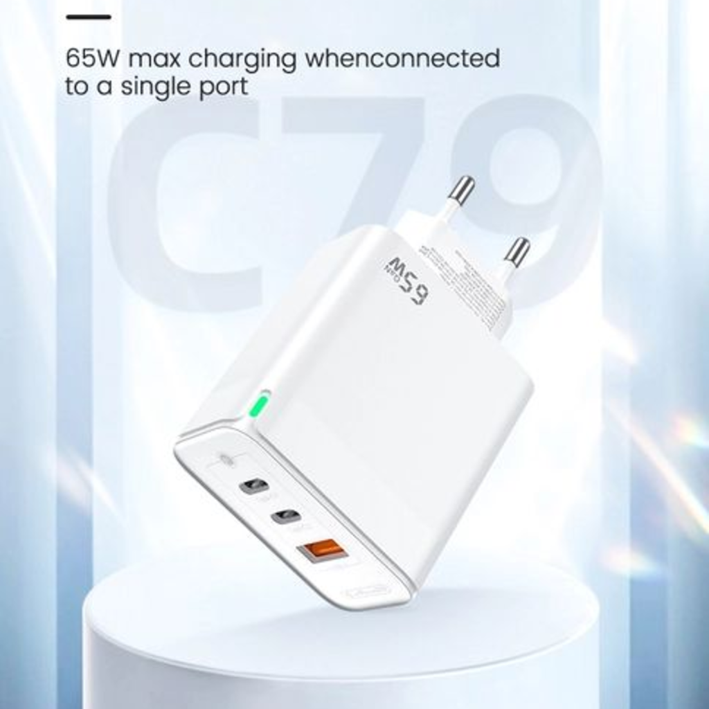 A töltő két USB-C portja és egy USB-A portja intelligensen osztja el a rendelkezésre álló energiát. Az USB-C portok Power Delivery (PD) támogatással rendelkeznek akár 65W-ig egyetlen port használatakor, míg az USB-A port Quick Charge 3.0 (QC3.0) technológiával 30W-ig képes tölteni. Így nem kell kompromisszumot kötnie a sebesség terén, még akkor sem, ha több eszközt tölt egyszerre.
