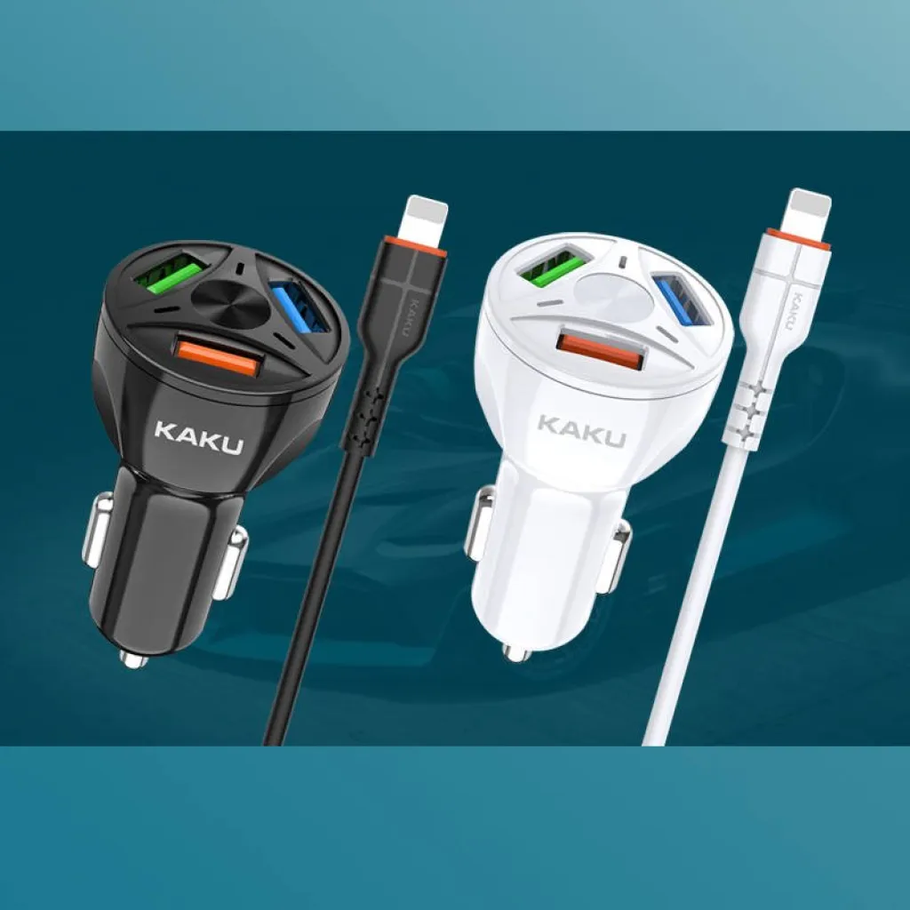 KAKU Univerzális autós töltő 20W 4,8A QC3.0 3xUSB + Lightning kábel fehér (KSC-493)