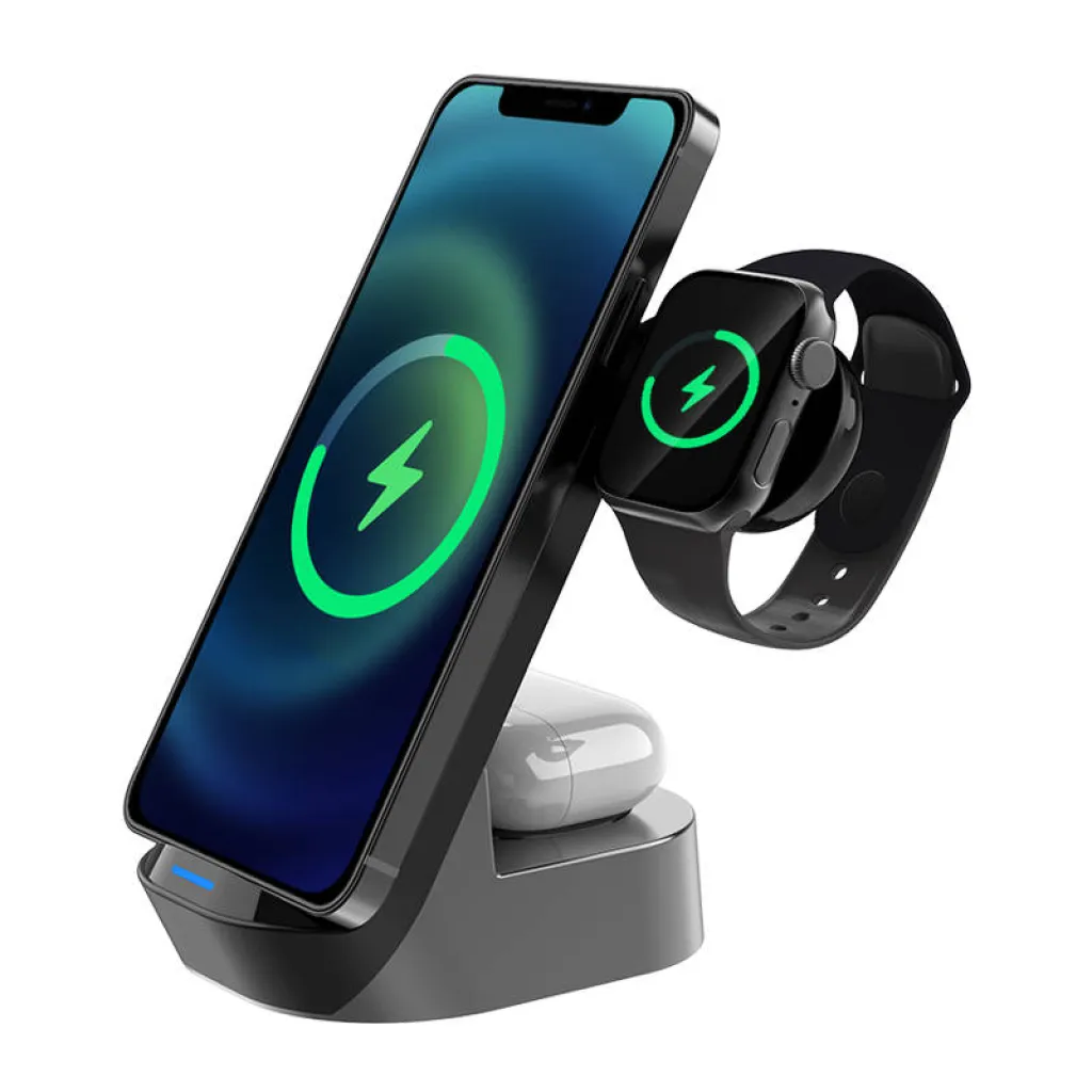 Vezeték nélküli töltő mobiltelefonhoz, Apple Watchhoz, AirPodshoz - 3 eszköz egyidejű töltését teszi lehetővé, 15 W (mobiltelefon) / 2,5 W (óra és fejhallgató) teljesítménye.