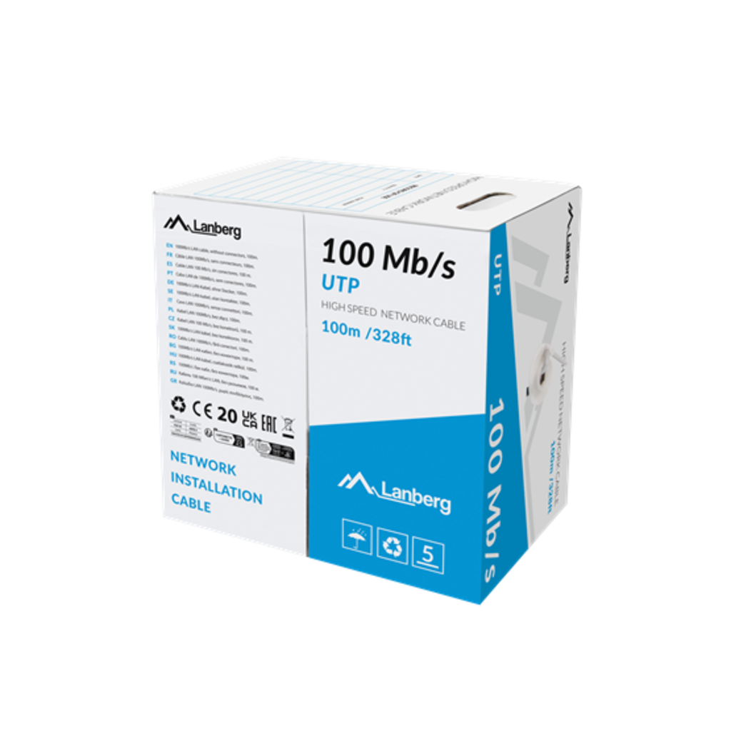 Lanberg Cat.5e U/UTP rézzel bevont (CCA) fali kábel 100m, 100Mb/s, AWG24, PVC, 100Mhz, Fca, szürke