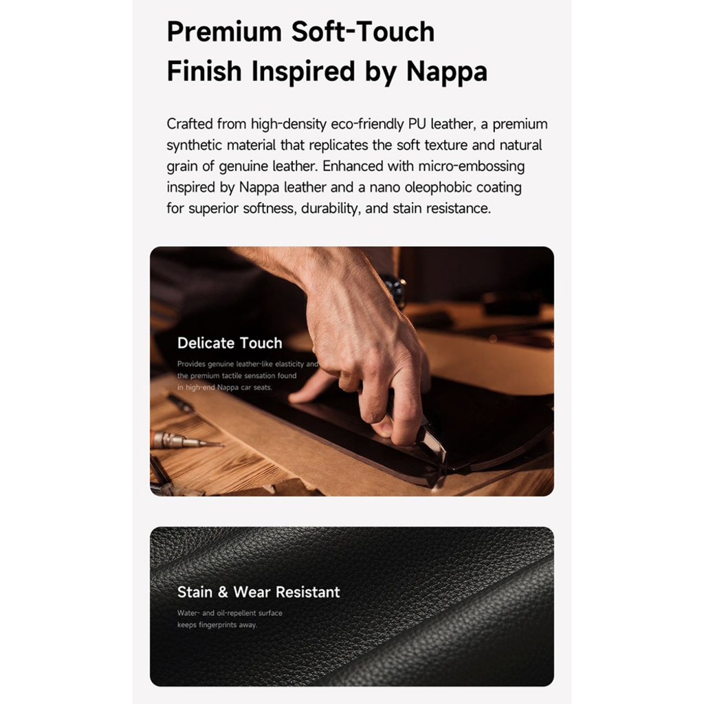 A Nappa sorozat ihlette prémium soft-touch felület a luxus és a kifinomultság érzetét nyújtja. A Mcdodo állvány magas sűrűségű, környezetbarát PU bőrből készült, amely kiválóan imitálja a valódi bőr puha textúráját és természetes erezetét. A speciális mikro-dombornyomás és a nano oleofób bevonat garantálja a kiváló puhaságot, tartósságot és foltállóságot. A felület víz- és olajtaszító tulajdonságának köszönhetően az ujjlenyomatok sem hagynak nyomot.