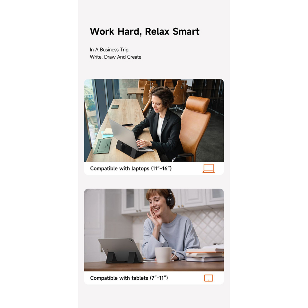 A "Dolgozz keményen, pihenj okosan" filozófiát szem előtt tartva ez az állvány tökéletes társ az üzleti utazásokhoz, íráshoz, rajzoláshoz, vagy akár otthoni munkához és szórakozáshoz. Kompatibilis mind a laptopokkal, mind a tabletekkel:
