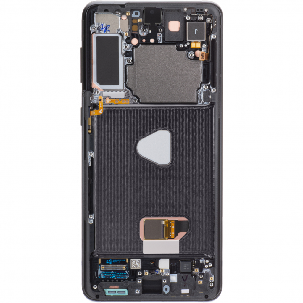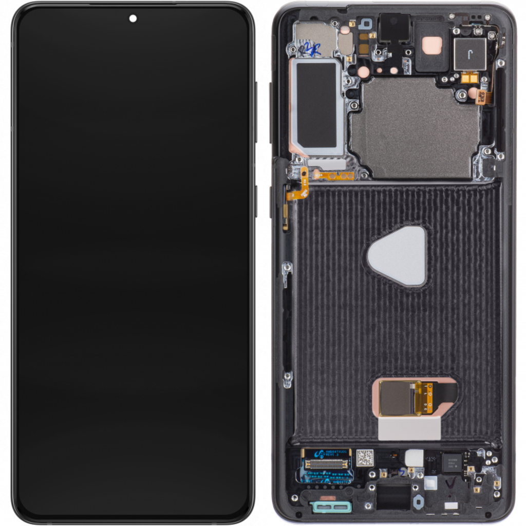LCD kijelző modul Samsung Galaxy S21+ 5G G996B - Fekete LCD kijelző érintőképernyővel/digitizerrel és keret összeszereléssel - eredeti szervizalkatrész. Ha a kijelződ repedt, karcos, pixelhibás, vonalakkal teli vagy vízkárosodott, ez a termék megoldást nyújt számodra. Ezzel az egységgel kicserélheted a Samsung Galaxy S21+ 5G G996B teljes elülső borítóját, beleértve a keretet, az üveget, az érintőképernyőt, az LCD kijelzőt, az oldalsó gombokat, a mikrokapcsolós oldalsó gombokat és a rezgő motorokat. Elülső kamera nélkül.