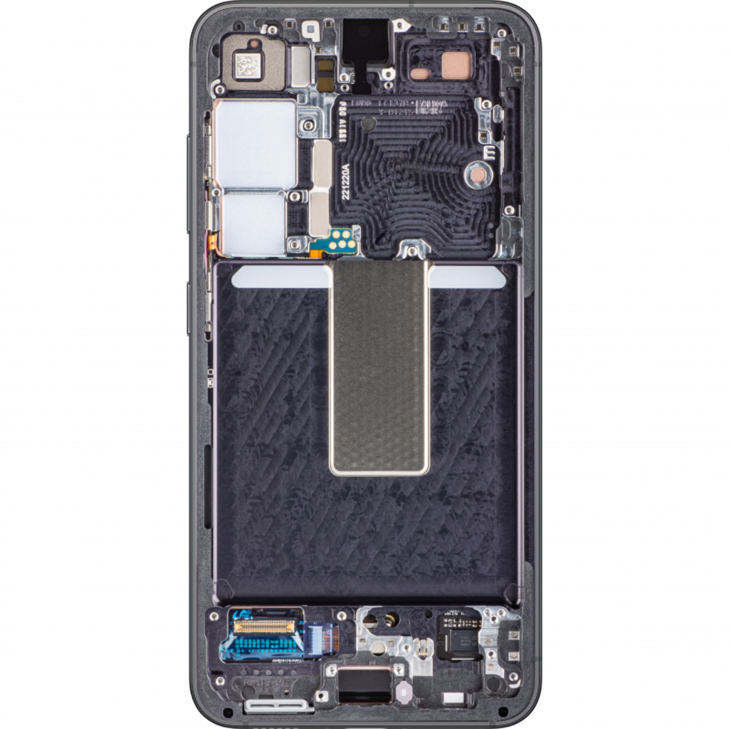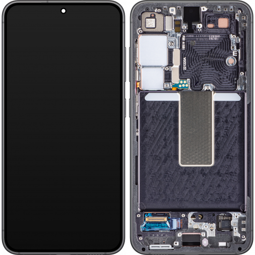 LCD kijelző modul Samsung Galaxy S23 S911 - Phantom Black. Samsung licenc alapján készült pótalkatrész, amely a sérült kijelző cseréjére szolgál. Kerettel, oldalgombok mikrokapcsolóival és oldalgombokkal van ellátva.